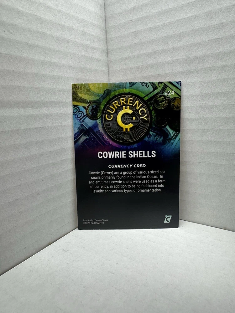 Introducing the 2023 Cardsmiths Currency Series 2 Base Cowrie Shells #24 trading card. This limited edition card is a must-have for collectors and features a beautiful design with high-quality card stock material. The card is an original and licensed reprint and is part of the 2023 Cardsmiths Currency Series 2 set. The card showcases Cowrie Shells, a popular character from the set, and is a non-sport trading card type. It has a standard card size and is written in English language. The card is perfect for anyone aged 4 and up and is an excellent addition to any collection. Get your hands on this exclusive card today!