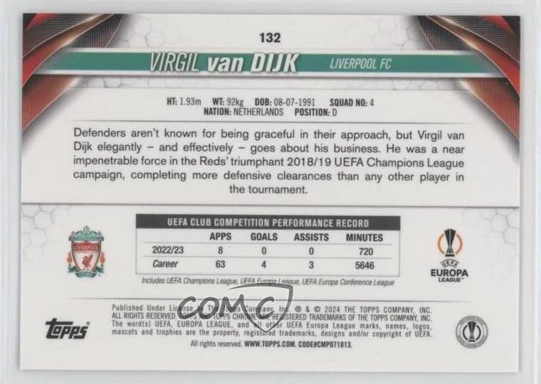 2023-24 Topps Chrome UEFA Club Competitions - [Base] - Pink Geometric Refractor #132 Virgil van Dijk Qty Made: 250 - Soccer Card - Featuring the Liverpool FC - Featuring Virgil Van Dijk Search for more: 2023-24 Topps Chrome UEFA Club Competitions Search for more: 2023-24 Topps Chrome UEFA Club Competitions - [Base] - Pink Geometric Refractor View all of our Listings Auctions Buy It Now About Us Located in the beautiful Pacific Northwest, COMC (Check Out My Cards) is the world's largest consignment service for trading card singles. More than 10,000 people have used our consignment service to list over 50 million trading cards. We currently house 20 million cards, each listed for sale with front and back images of the actual card. Find out how we can help you consign your items on eBay by contacting us through eBay messaging. COMC -- "The Safe & Easy Way to Buy & Sell" Representative Image - Select Specific Item above to see image of actual item Representative Image - Select Specific Item above to see image of actual item Raw Condition for Modern Cards Unless otherwise noted, raw modern cards are listed in Near Mint-Mint condition or better. A NM-MT card appears to be Mint at first glance, but upon closer inspection, may exhibit some of the following: minor print defects (e.g. roller marks, print line, dimple), minor scratches, slight edge wear, and slight corner wear. Centering is clearly visible in the images provided and does not factor into our condition assessment. Raw Condition for Vintage Cards Unless otherwise noted, raw vintage cards are listed in Excellent condition or better. An EX card may exhibit some of the following: minor rounding of corners, surface wear, print defects, light scratches, and slight edge wear/chipping. Centering is clearly visible in the images provided and does not factor into our condition assessment. Domestic Shipping Combined shipping for multiple items is available. To receive combined shipping, please ensure all desired items are in your eBay shopping cart before proceeding to checkout. eBay limits orders to 40 items per order. We automatically combine multiple orders placed on the same day. If you place multiple orders on the same day, please contact us to request a refund of applicable shipping costs. Signature confirmation may be required on invoices over $400. Raw cards are shipped in toploaders. International Shipping COMC offers eBay's International Shipping (EIS) for international orders under $2,500* (see country exceptions below). All duties and import fees are paid at checkout; in the rare event that there are additional import fees upon delivery, these are borne by the buyer. EIS packages route through a shipping hub in Erlanger, KY before shipping to their final destination. Please note that EIS does not allow for combined shipments. The shipping rates are determined by eBay and cannot be adjusted. *Maximum sale price exceptions: Colombia, Kuwait ($2,000); Taiwan ($1,539); Chile, Costa Rica, Guatemala, Honduras, Trinidad and Tobago ($1,000); Antigua and Barbuda, Aruba, Belize, Dominica, Grenada, Philippines, Saint Kitts and Nevis, Saint Lucia, Montserrat, Turks and Caicos Islands ($500); Dominican Republic, El Salvador ($200). Please request a shipping quote through eBay messaging for orders that exceed the maximum sale price supported by eBay's International Shipping. You will be responsible for all duties and import fees for international orders shipped outside the EIS. Raw cards are shipped in toploaders. Payment COMC does not accept offers on our cards through our eBay storefront. COMC utilizes eBay’s managed payments system. If you are experiencing difficulties making a payment, please contact eBay for assistance. Return Policy Returns are only accepted on the rare occasion the item is not as described. If you are making a return, please initiate the return process through eBay so a mailing label can be provided for you. Prior to listing, our expert team carefully assessed this item to represent it accurately. Please review the description and high-definition images prior to purchasing to ensure this item meets your satisfaction. We welcome you to contact us if you have further questions about this item. Trust and Integrity COMC carefully assesses each item consigned to us to prevent fraudulent items from entering the marketplace. If you believe an item offered on COMC may be fraudulent, please contact us with details so we can investigate the issue. Items we determine are outside our supported items policy may be removed. Last Modified: 11/11/2024 11:58:00 AM PDT