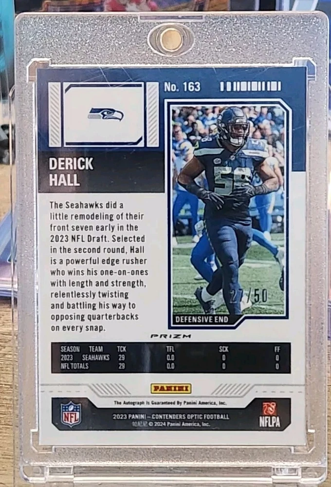 Capture a piece of sports history with the 2023 Panini Contenders Optic Derick Hall Rookie Ticket card. This limited edition piece, numbered 27 out of 50, is a must-have for football enthusiasts and collectors alike. The card showcases the promising talent of Derick Hall, a standout player for the Seattle Seahawks. Crafted with care by Panini, the card features an eye-catching Orange Prizm parallel that truly makes it stand out. Part of the base set, it comes serial numbered, ensuring its uniqueness and collectibility. Whether you're a fan of the NFL, a follower of the Seattle Seahawks, or a dedicated collector of sports trading cards, this piece is an exceptional find.