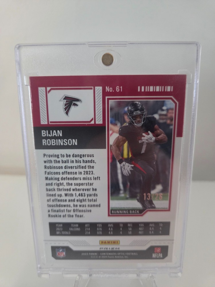 2023 Contenders Optic Bijan Robinson Rookie Card FOTL PURPLE PULSAR PRIZM #'d /26 Sharp Corners AWESOME card He's only getting better!