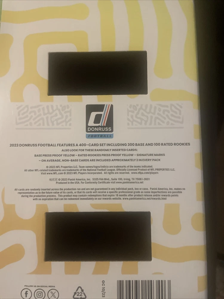 League: Boxing Sport: Football Year Manufactured: 2023 Type: Sports Trading Card Player/Athlete: Patrick Mahomes Country/Region of Manufacture: United States Event/Tournament: Super Bowl Manufacturer: Donruss Set: 2023 Season: 2023 Configuration: Box Autograph Authentication: Donruss Vintage: No Material: Card Stock Features: Rookie Number of Cards: 80 Team: Kansas City Chiefs