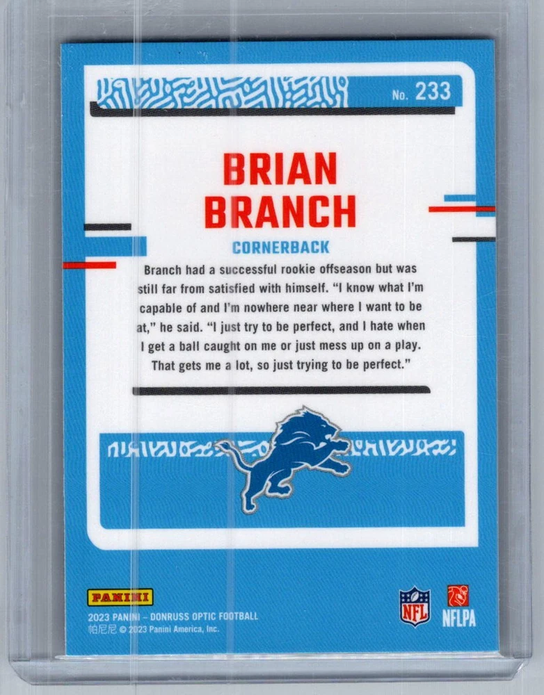 This is a nice example of a 2023 Donruss Optic #233 Brian Branch Other important information about this card: In 2023 Brian Branch played for the Detroit Lions. Please check out our other listings for more great cards.