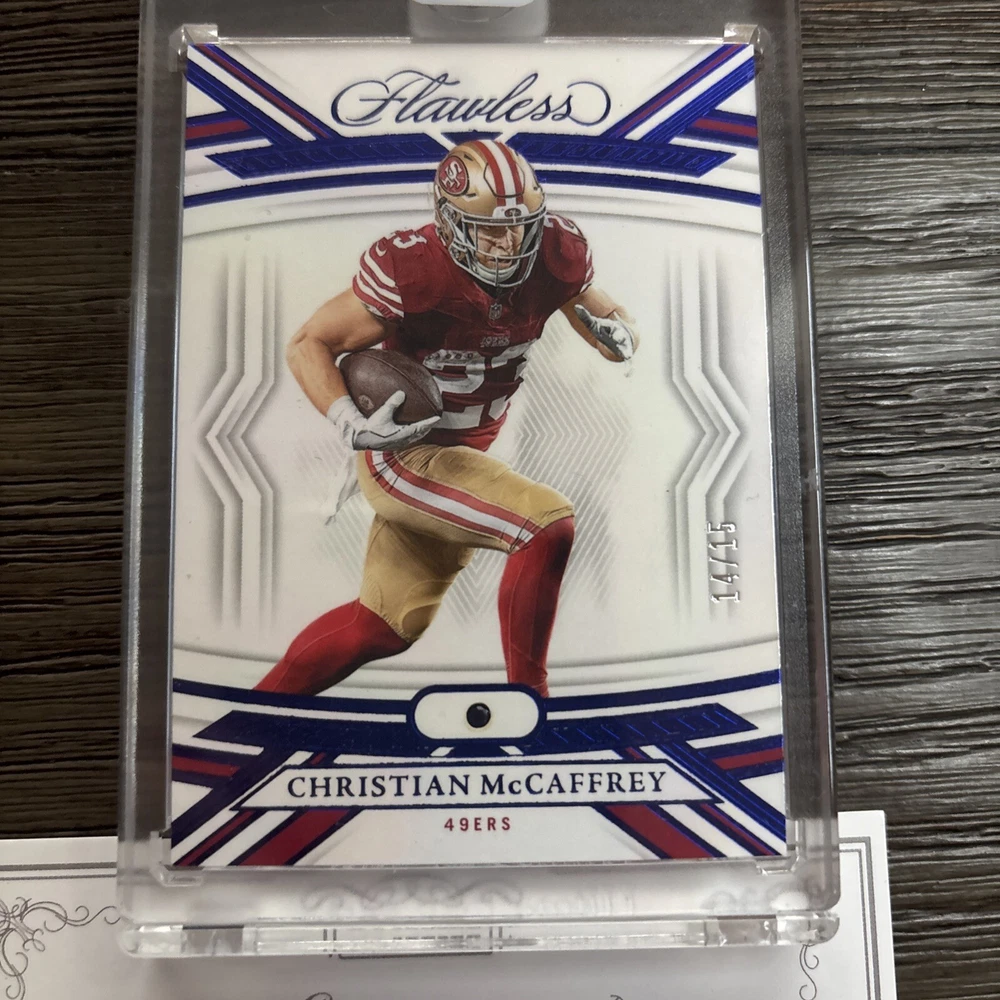 Elevate your sports memorabilia collection with the 2023 Panini Flawless Christian McCaffrey Sapphire Gem card, numbered 62. This exquisite piece features the dynamic San Francisco 49ers running back and is a must-have for football enthusiasts and collectors alike. With a limited print run of just 15, this card is not only a rare find but also a testament to McCaffrey's prowess on the field during the 2023 NFL season. Crafted with precision, this sports trading card boasts an array of features including an insert, serial number, and the sought-after Sapphire parallel variety, ensuring its uniqueness and value. The card comes encased in a protective display-ready packaging, making it an ideal showpiece for your collection or as a treasured gift for the dedicated fan.