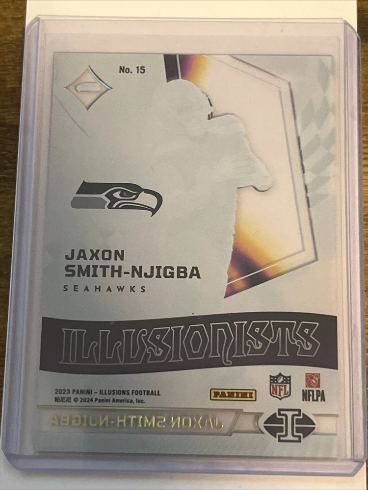Sport: Football Manufacturer: Panini Team: Seattle Seahawks Season: 2023 Card Number: 15 Set: 2023 illusions football Features: Insert, Rookie, Short Print Type: Sports Trading Card Player/Athlete: Jaxon Smith-Njigba League: National Football League (NFL) Parallel/Variety: Green Autographed: No