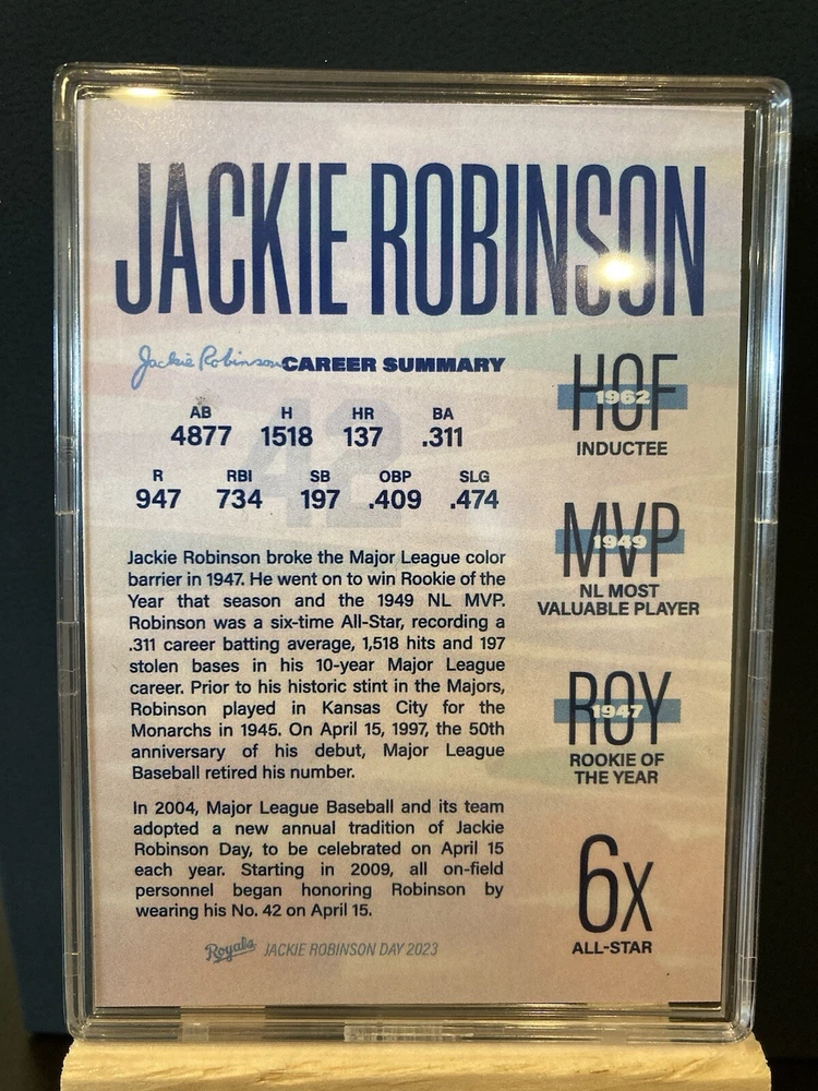This 2023 Jackie Robinson Day Baseball Card is a must-have for any collector. Featuring the legendary Jackie Robinson of the Brooklyn Dodgers, this card is sure to be a prized possession. The card comes in a hard case and is near mint or better conditioned, making it an excellent addition to any collection. The card is from the Major League (MLB) and is a Sports Trading Card. It features the player's name, team, and season, making it a great piece of memorabilia for any baseball fan. The card is ungraded, and is a part of the Sports Mem, Cards & Fan Shop category. Don't miss out on the chance to own this piece of baseball history.
