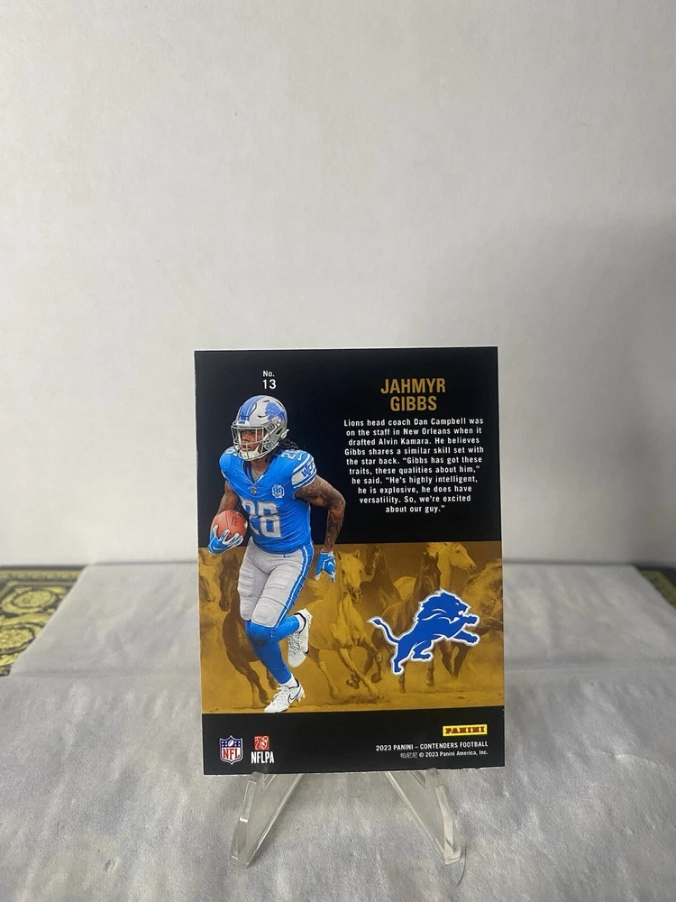 This is a rare and highly sought-after 2023 Panini Contenders Rookie Stallions #13 RC trading card featuring Jahmyr Gibbs of the Detroit Lions. As a sports trading card, it is perfect for avid collectors and fans of the National Football League (NFL). The card is manufactured by Panini and is part of the 2023 set. The card's features include being a rookie insert, making it an excellent addition to any collection. It is also a great investment for the future, as it is sure to increase in value over time. Don't miss out on the opportunity to own this amazing card!