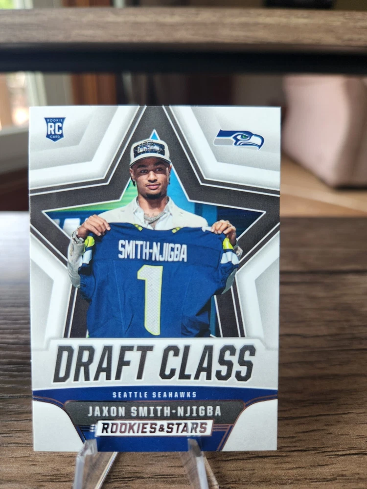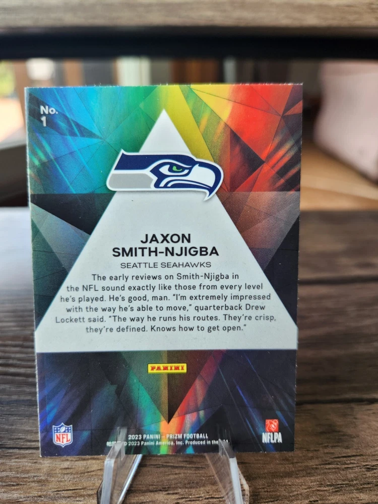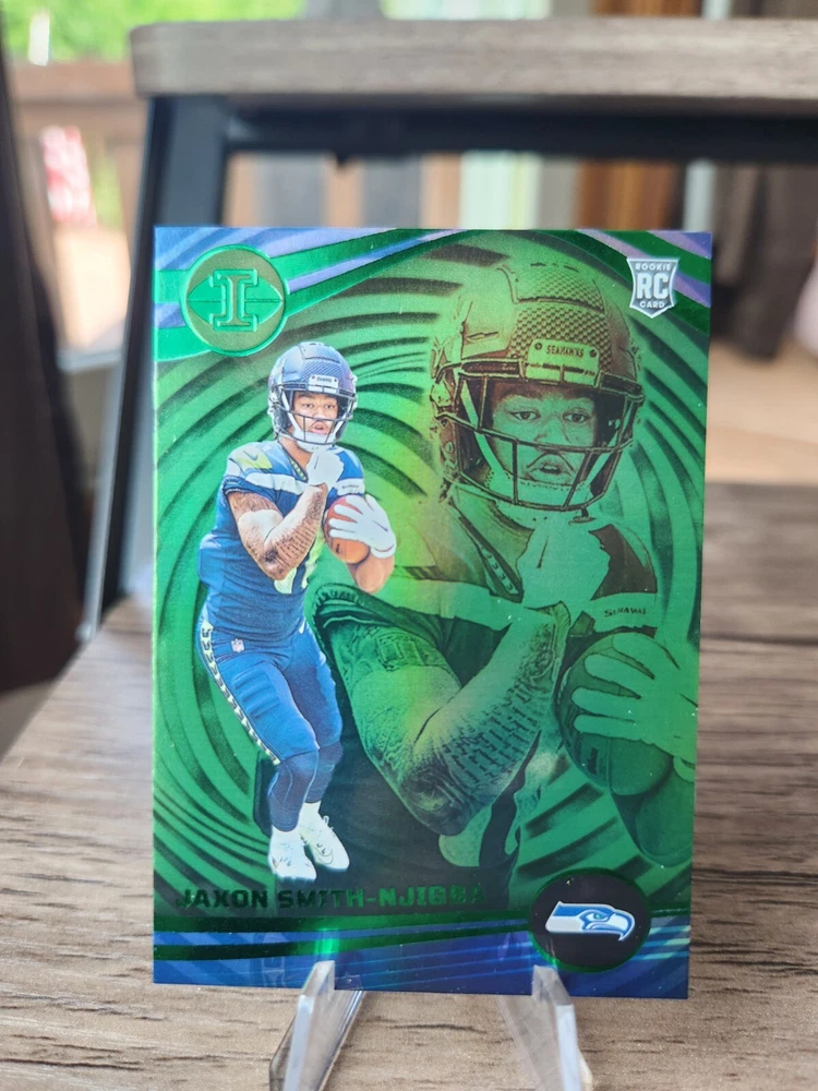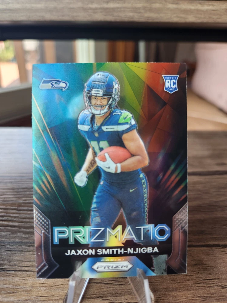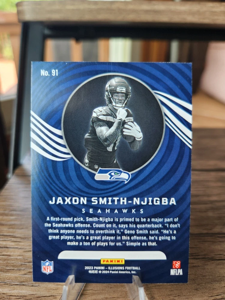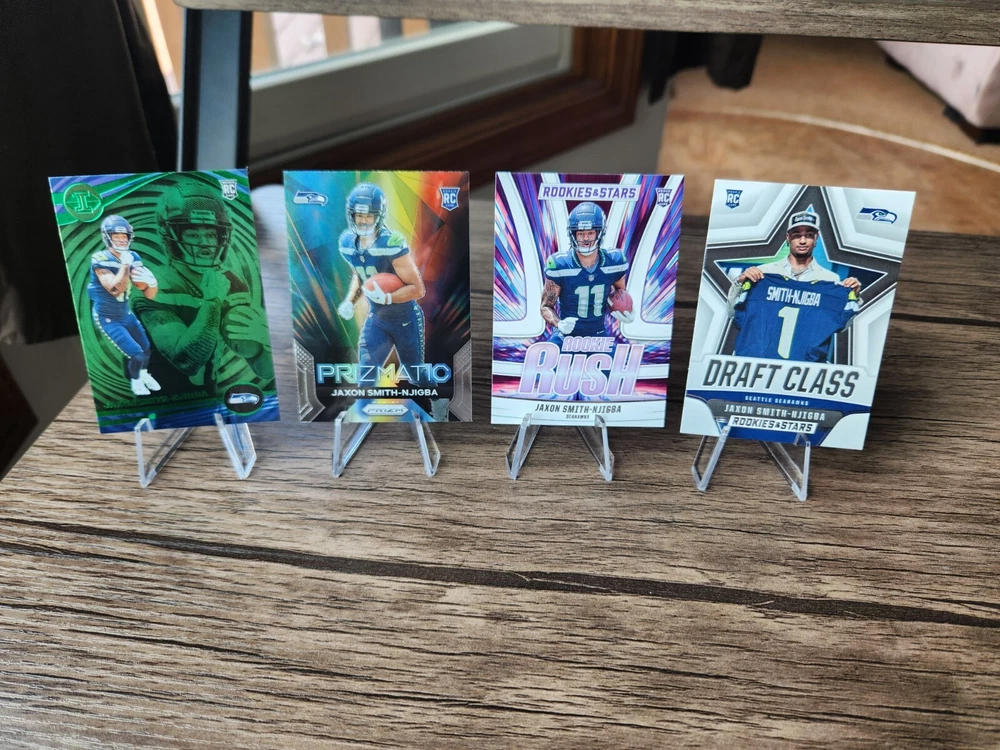 2023 Prizm Jaxon Smith-Njigba Prizmatic Rookie Card #1, 2023 Illusions Jaxon Smith-Njigba Green Holo Rookie Card #91, 2023 Rookies and Stars Jaxon Smith-Njigba Draft Class Rookie Card #DC-9, 2023 Rookies and Stars Jaxon Smith-Njigba Rookie Rush Rookie Card #RR-9. Cards will be shipped in a 6x9 bubble mailer. I do offer combined shipping on multiple orders.