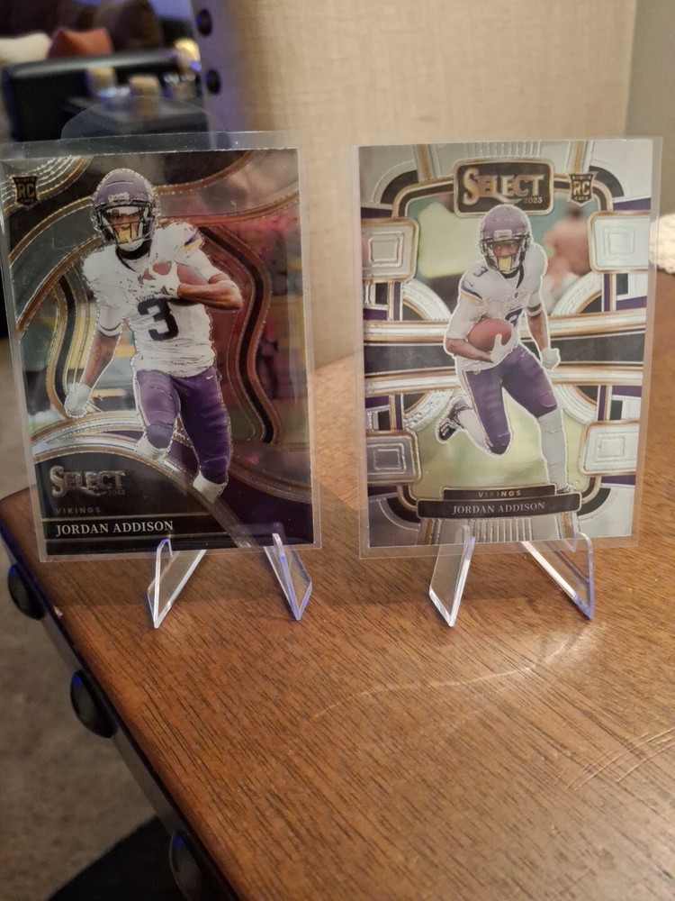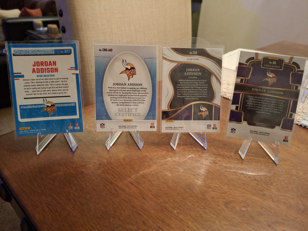 The product is a 2023 Jordan Addison rookie trading card lot featuring a total of 4 cards. Manufactured by Panini for the 2024 season, the set includes cards from the 2023 Donruss Optic and 2023 Select collections. The cards feature Jordan Addison, a player for the Minnesota Vikings in the National Football League (NFL). The lot includes base set, rookie, and insert cards at different levels such as Select Certified, Base, Field Level, and Donruss Optic. The cards are not autographed and are from the country/region of Jordan.