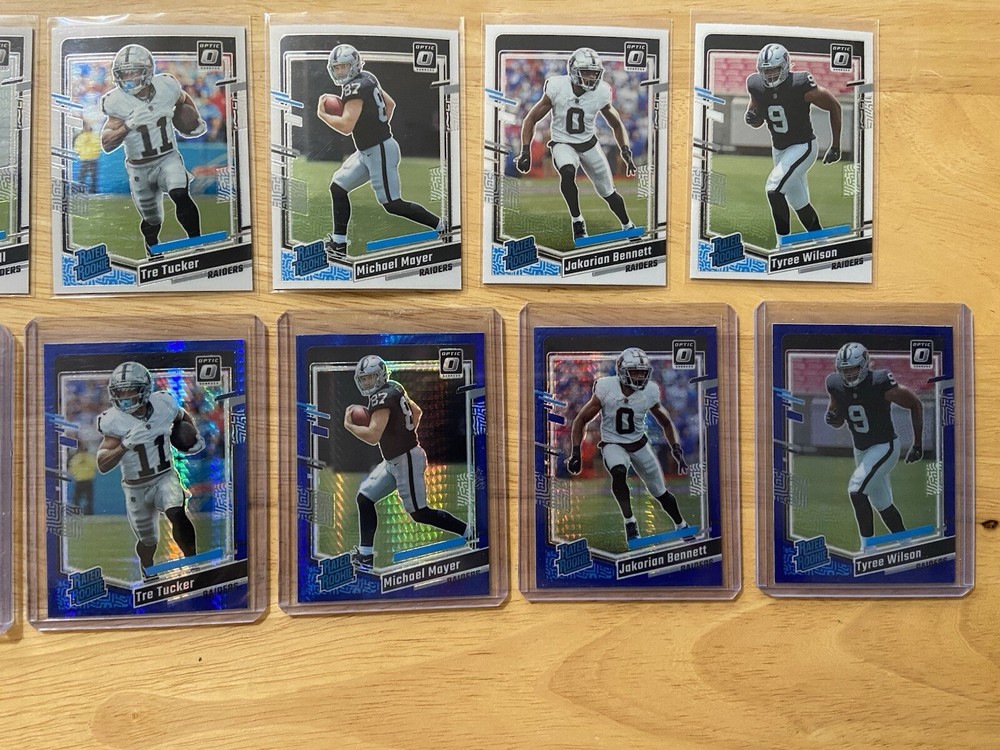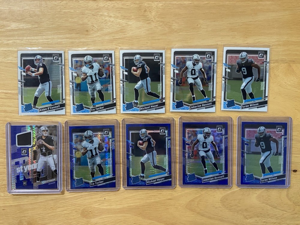 2023 Panini Optic Las Vegas Raiders 10 Rated Rookie Card Lot! Includes 5 Base Rated Rookies, 4 Blue Scope Rated Rookies & 1 Patch Card. Aidan O’Connell Tre Tucker Michael Mayer Tyree Wilson Jakorian Bennett
