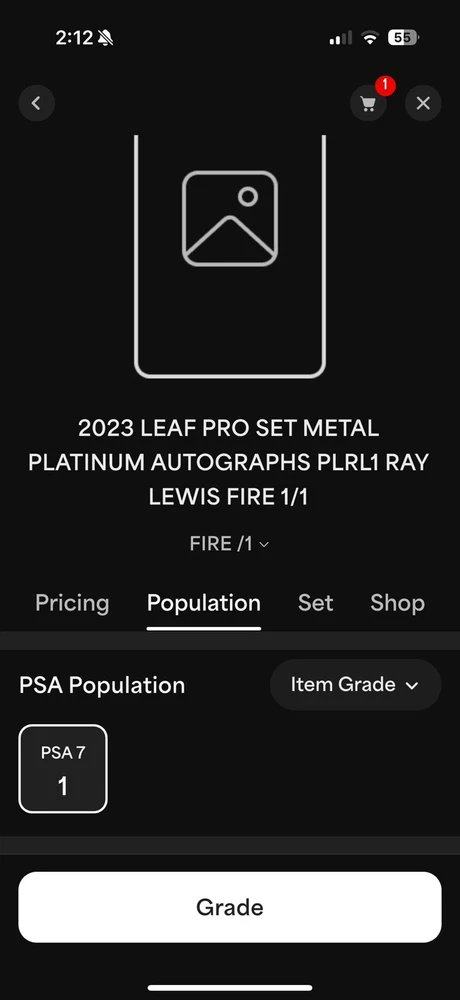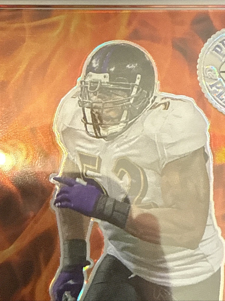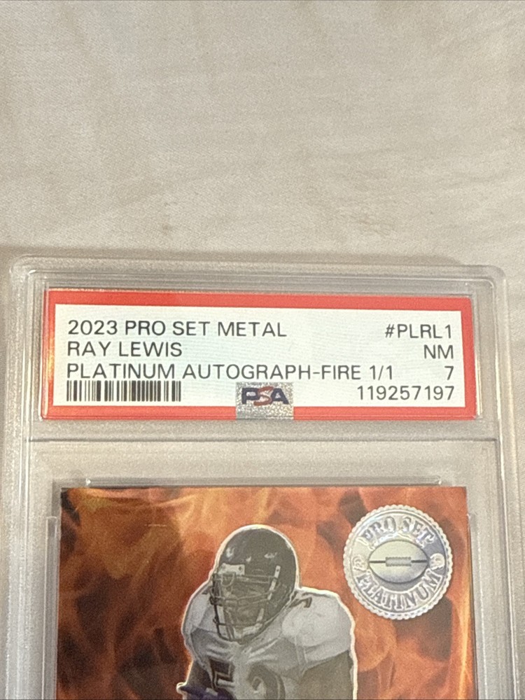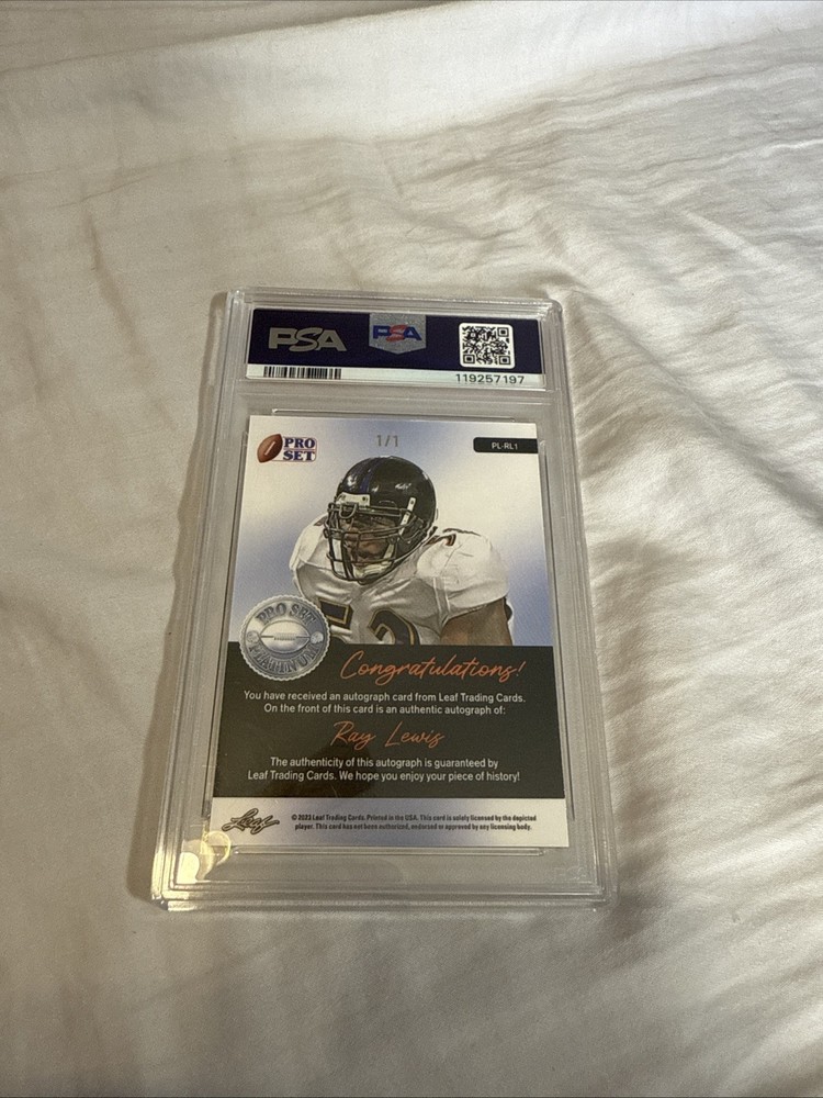 The 2023 Leaf Pro Set Metal Ray Lewis Auto 1/1 trading card is a highly collectible item featuring the legendary NFL player from the Baltimore Ravens. This one-of-a-kind card is autographed by Ray Lewis and has a print run of just 1, making it a rare and sought-after piece for football card collectors. With a grade of 7 from Professional Sports Authenticator (PSA), this original card is a valuable addition to any sports trading card collection, especially for fans of the NFL and the Baltimore Ravens.