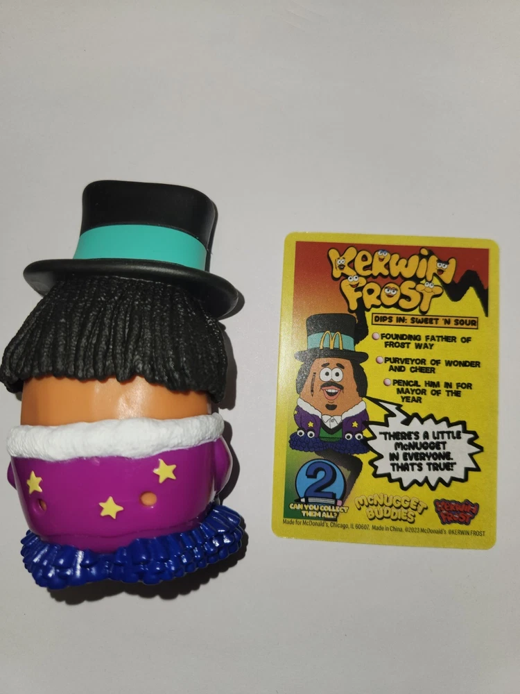 The product is a 2023 McDonald's Kerwin Frost McNugget Nugget Buddies toy with a card included. It features Kerwin Frost as the character family, making it appealing to fans of the brand. The toy is designed for children aged 3 and up, with age levels ranging from 3-4 years to 17 years and older. It is not a custom bundle and has not been modified, offering collectors and fans a unique McDonald's branded item to add to their collection.