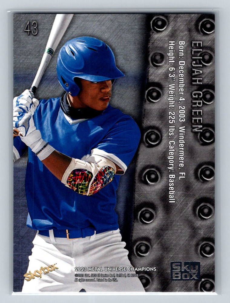 This is a nice example of a 2023 SkyBox Metal Universe Champions #43 Elijah Green Metal Universe Championship 1998-99 Retro Other important information about this card: In 2023 Elijah Green played for the . Please check out our other listings for more great cards.
