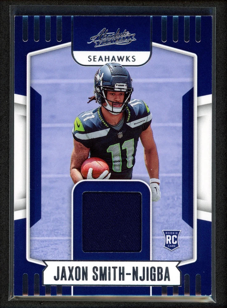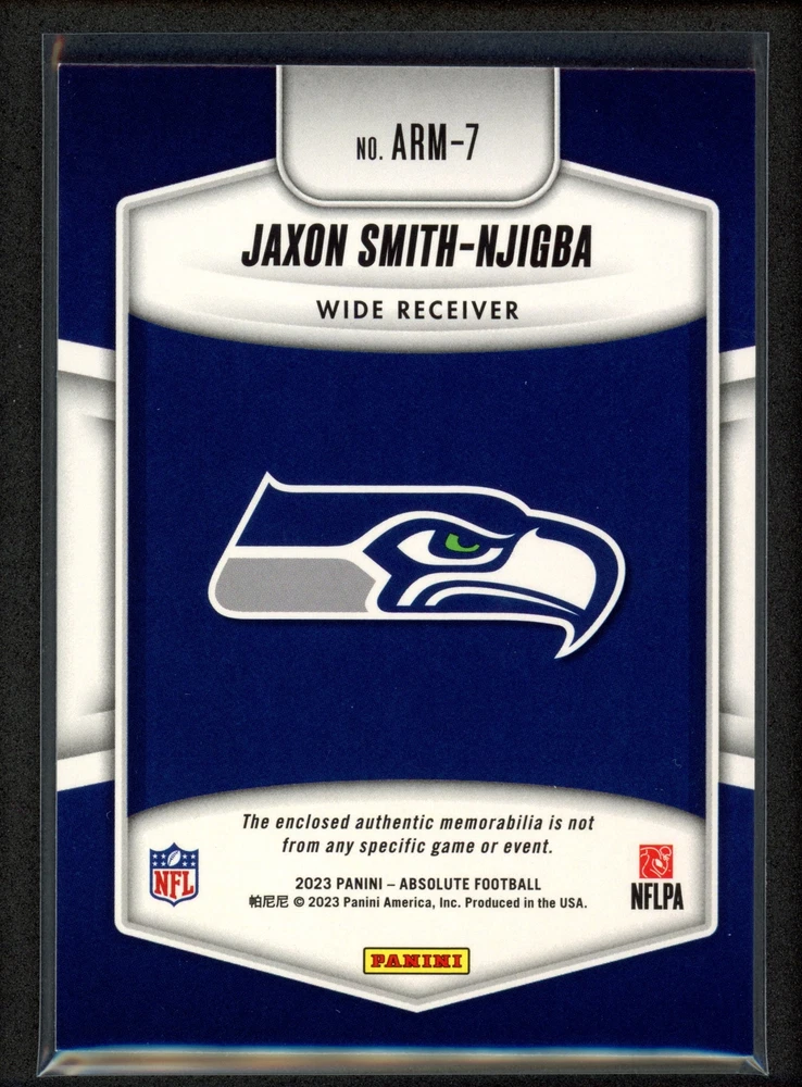 Card Number: ARM-7 brand: Panini Team: Seattle Seahawks Features: Rookie, Insert, Memorabilia Insert Set: Absolute Rookie Materials Season: 2023 Series: Panini Absolute Set: 2023 Panini Absolute Manufacturer: Panini Player/Athlete: Jaxon Smith-Njigba Sport: Football League: National Football League (NFL)