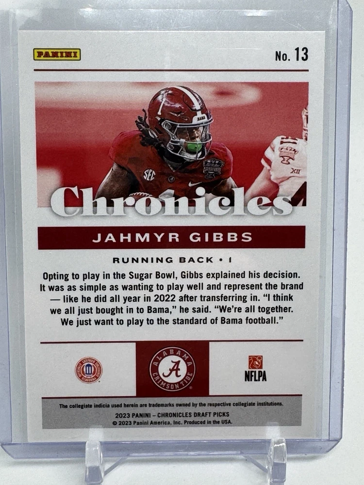 Get ready for the 2023 NFL draft with this rare and highly sought-after Panini Chronicles Draft Picks trading card featuring Jahmyr Gibbs (RC). This card is a must-have for any sports trading card collector or fan of the Atlanta Falcons. Chronicle the excitement of the upcoming draft with this stunning card that showcases the talent of one of the top prospects in the game. Add it to your collection or gift it to a fellow sports enthusiast. Don't miss out on the opportunity to own a piece of NFL history.