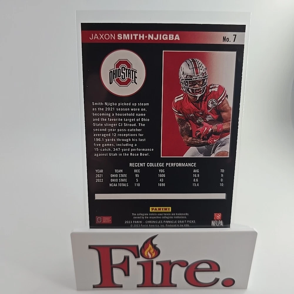 Sport: Football Player/Athlete: Jaxon Smith-Njigba Team: Ohio State Buckeyes League: National Collegiate Athletic Association (NCAA) Season: 2023 Card Size: Standard Original/Licensed Reprint: Original Insert Set: Pinnacle Set: 2023 Panini Chronicles Draft Picks Card Name: Chronicles Pinnacle Draft Picks Manufacturer: Panini Autographed: No Card Number: 7 Type: Sports Trading Card Vintage: No Features: Rookie, Insert
