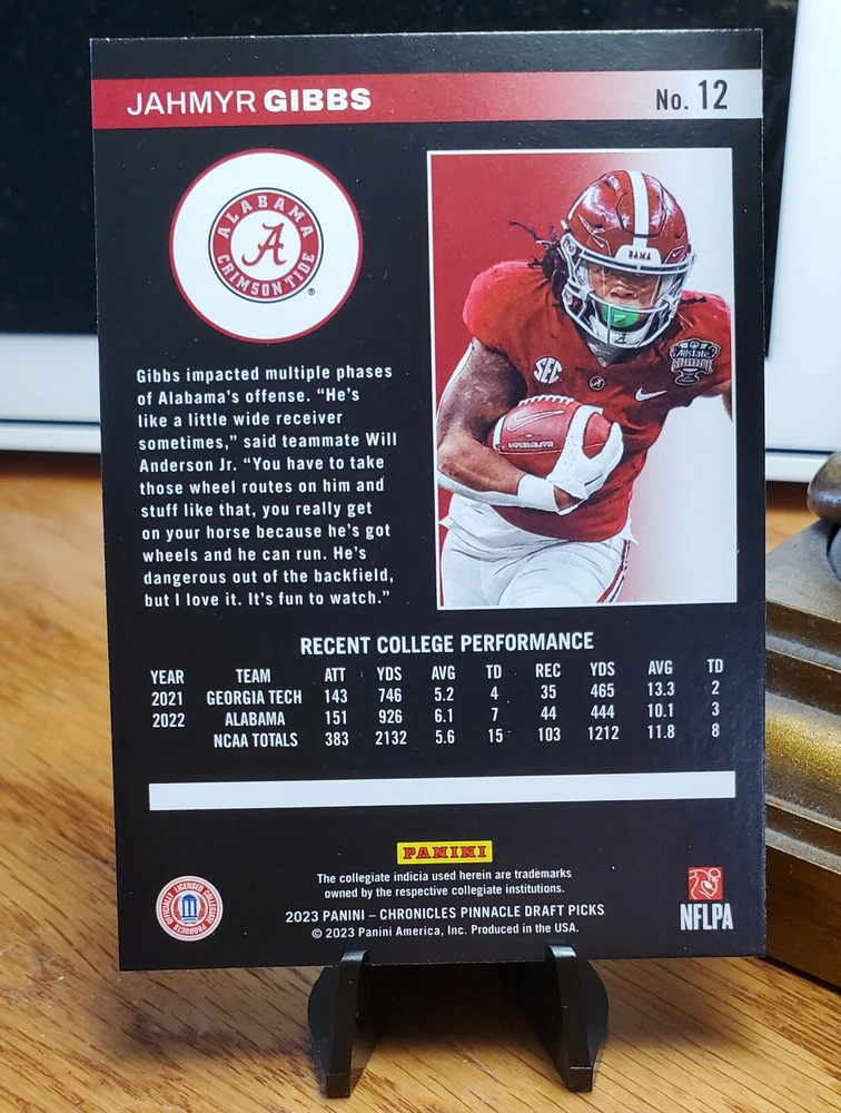 2023 Panini Chronicles Draft Picks Pinnacle Jahmyr Gibbs RC #12 BAMA/DET