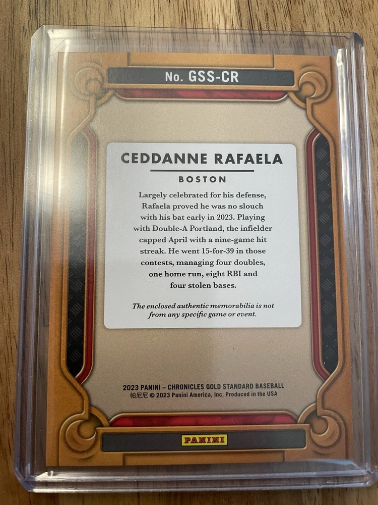 This is a rare 2023 Panini Chronicles baseball card featuring Ceddanne Rafaela, a promising rookie player. The card is an insert in the Gold Standard Swatches set and has a card number of GSS-CR. It is a sports trading card with memorabilia features, perfect for collectors and fans alike. The card is manufactured by Panini and is in excellent shape, near mint or better. It is ungraded and comes from the Major League Baseball (MLB) league. This card is a must-have for any baseball card collector who wants to add a valuable piece to their collection.
