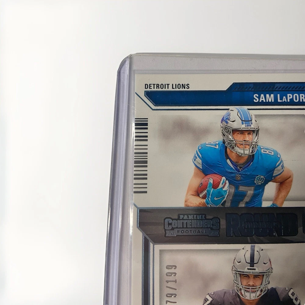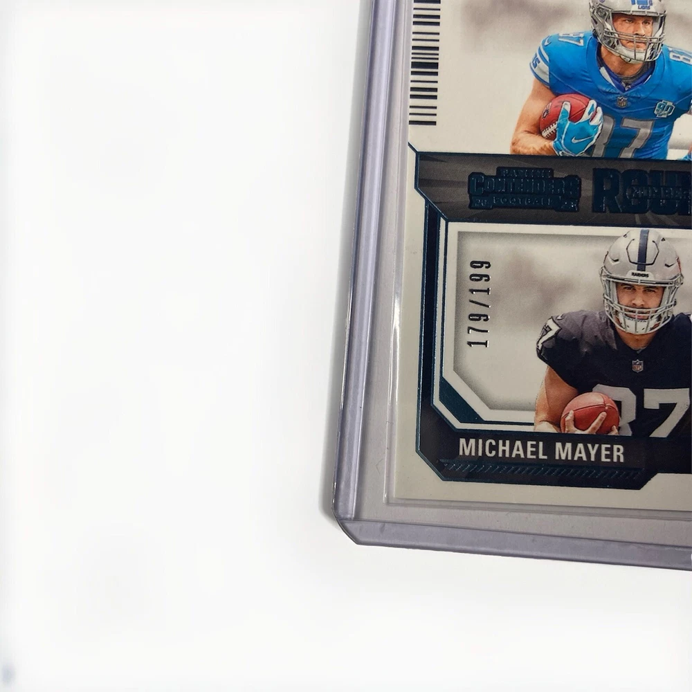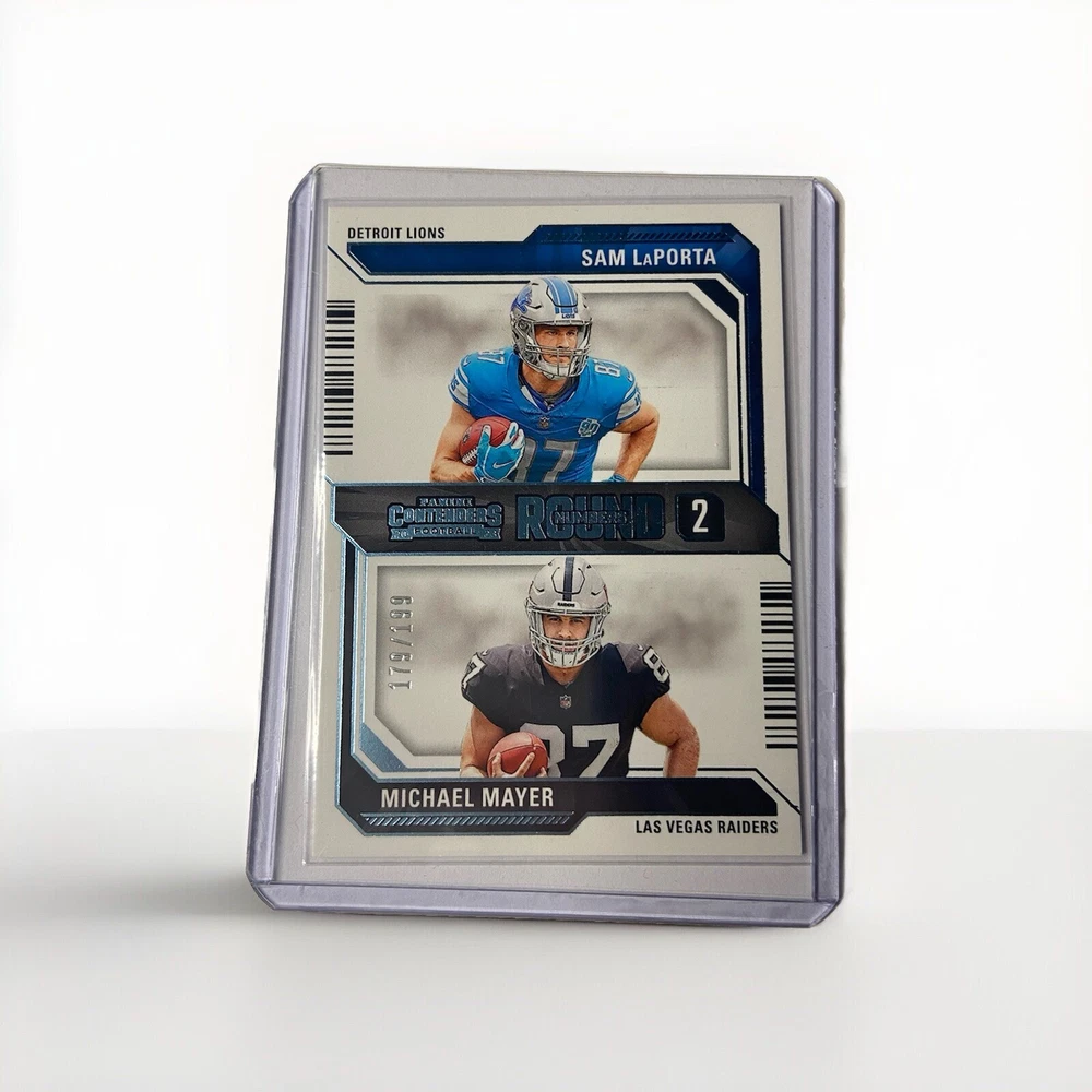 This 2023 Panini Contenders Rookie #13 trading card features Michael Mayer and Sam LaPorta with a print run of 199 Blue Foil. The card is part of the Round Numbers insert set and is serial numbered as a parallel variety. It is a sports trading card for football enthusiasts and is an excellent addition to any collection. The card is manufactured by Panini and is in perfect condition