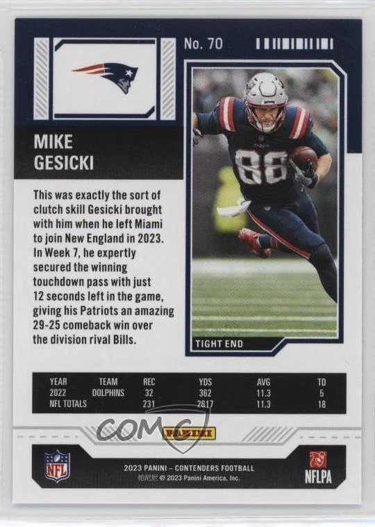 2023 Panini Contenders - [Base] #70 Season Ticket - Mike Gesicki - Football Card - Featuring the New England Patriots - Featuring Mike Gesicki Search for more: 2023 Panini Contenders Search for more: 2023 Panini Contenders - [Base] View all of our Listings Auctions Buy It Now About Us Located in the beautiful Pacific Northwest, COMC (Check Out My Cards) is the world's largest consignment service for trading card singles. More than 10,000 people have used our consignment service to list over 50 million trading cards. We currently house 20 million cards, each listed for sale with front and back images of the actual card. Find out how we can help you consign your items on eBay by contacting us through eBay messaging. COMC -- "The Safe & Easy Way to Buy & Sell" Representative Image - Select Specific Item above to see image of actual item Representative Image - Select Specific Item above to see image of actual item Raw Condition for Modern Cards Unless otherwise noted, raw modern cards are listed in Near Mint-Mint condition or better. A NM-MT card appears to be Mint at first glance, but upon closer inspection, may exhibit some of the following: minor print defects (e.g. roller marks, print line, dimple), minor scratches, slight edge wear, and slight corner wear. Centering is clearly visible in the images provided and does not factor into our condition assessment. Raw Condition for Vintage Cards Unless otherwise noted, raw vintage cards are listed in Excellent condition or better. An EX card may exhibit some of the following: minor rounding of corners, surface wear, print defects, light scratches, and slight edge wear/chipping. Centering is clearly visible in the images provided and does not factor into our condition assessment. Domestic Shipping Combined shipping for multiple items is available. To receive combined shipping, please ensure all desired items are in your eBay shopping cart before proceeding to checkout. eBay limits orders to 40 items per order. We automatically combine multiple orders placed on the same day. If you place multiple orders on the same day, please contact us to request a refund of applicable shipping costs. Signature confirmation may be required on invoices over $400. Raw cards are shipped in toploaders. International Shipping COMC offers eBay's International Shipping (EIS) for international orders under $2,500* (see country exceptions below). All duties and import fees are paid at checkout; in the rare event that there are additional import fees upon delivery, these are borne by the buyer. EIS packages route through a shipping hub in Erlanger, KY before shipping to their final destination. Please note that EIS does not allow for combined shipments. The shipping rates are determined by eBay and cannot be adjusted. *Maximum sale price exceptions: Colombia, Kuwait ($2,000); Taiwan ($1,539); Chile, Costa Rica, Guatemala, Honduras, Trinidad and Tobago ($1,000); Antigua and Barbuda, Aruba, Belize, Dominica, Grenada, Philippines, Saint Kitts and Nevis, Saint Lucia, Montserrat, Turks and Caicos Islands ($500); Dominican Republic, El Salvador ($200). Please request a shipping quote through eBay messaging for orders that exceed the maximum sale price supported by eBay's International Shipping. You will be responsible for all duties and import fees for international orders shipped outside the EIS. Raw cards are shipped in toploaders. Payment COMC does not accept offers on our cards through our eBay storefront. COMC utilizes eBay’s managed payments system. If you are experiencing difficulties making a payment, please contact eBay for assistance. Return Policy Returns are only accepted on the rare occasion the item is not as described. If you are making a return, please initiate the return process through eBay so a mailing label can be provided for you. Prior to listing, our expert team carefully assessed this item to represent it accurately. Please review the description and high-definition images prior to purchasing to ensure this item meets your satisfaction. We welcome you to contact us if you have further questions about this item. Trust and Integrity COMC carefully assesses each item consigned to us to prevent fraudulent items from entering the marketplace. If you believe an item offered on COMC may be fraudulent, please contact us with details so we can investigate the issue. Items we determine are outside our supported items policy may be removed. Last Modified: 12/18/2024 5:03:29 AM PDT