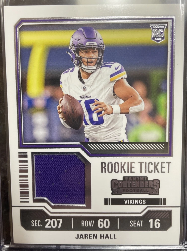 This 2023 Panini Contenders TS16 Jarren Hall Rookie Ticket Jersey Relic card is a must-have for any NFL fan or collector. The card features a standard size with an English language and is manufactured by Panini in the United States. It is an officially licensed product of the National Football League (NFL) and is not autographed. The card is a part of the 2023 Panini Contenders set and features a relic of Jarren Hall's jersey, making it a unique and valuable addition to any collection. The card is perfect for fans of the Minnesota Vikings or Brigham Young University (BYU) and is a great way to show support for your favorite team. Add this Sports Trading Card to your collection today!