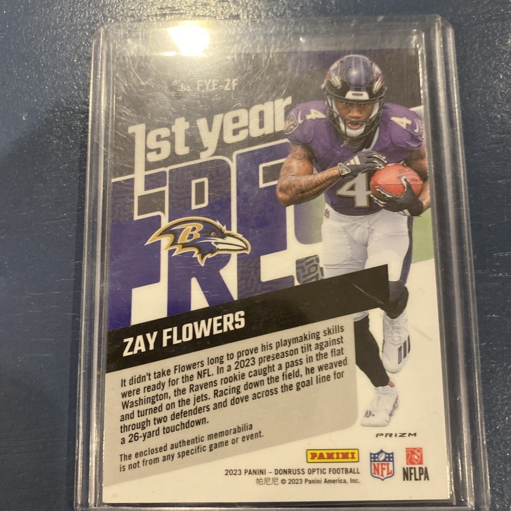 This trading card features Zay Flowers, a rookie football player, from the 2023 Panini Donruss Optic series. The card is a 1st Year Fresh Blue Hyper Prizm variant, indicating a special design with vibrant colors. It is classified as a sports trading card in near mint or better condition, making it a desirable collectible for football fans and card enthusiasts. The card's unique design and rookie player status add to its appeal for collectors looking to add it to their collection.