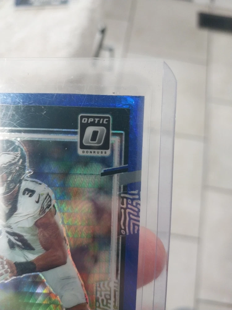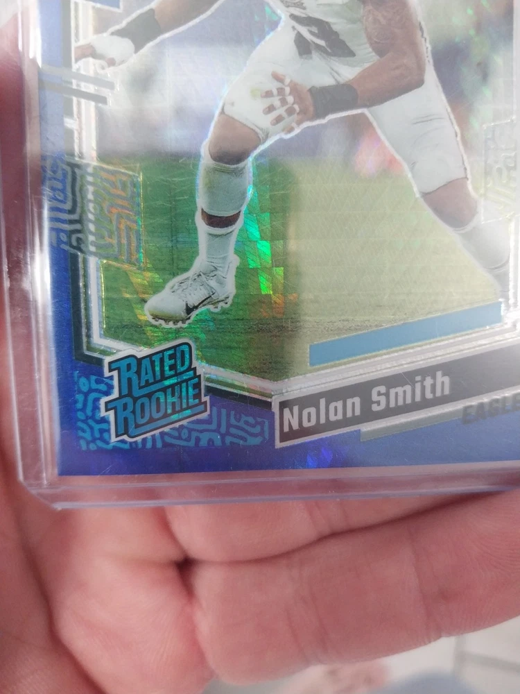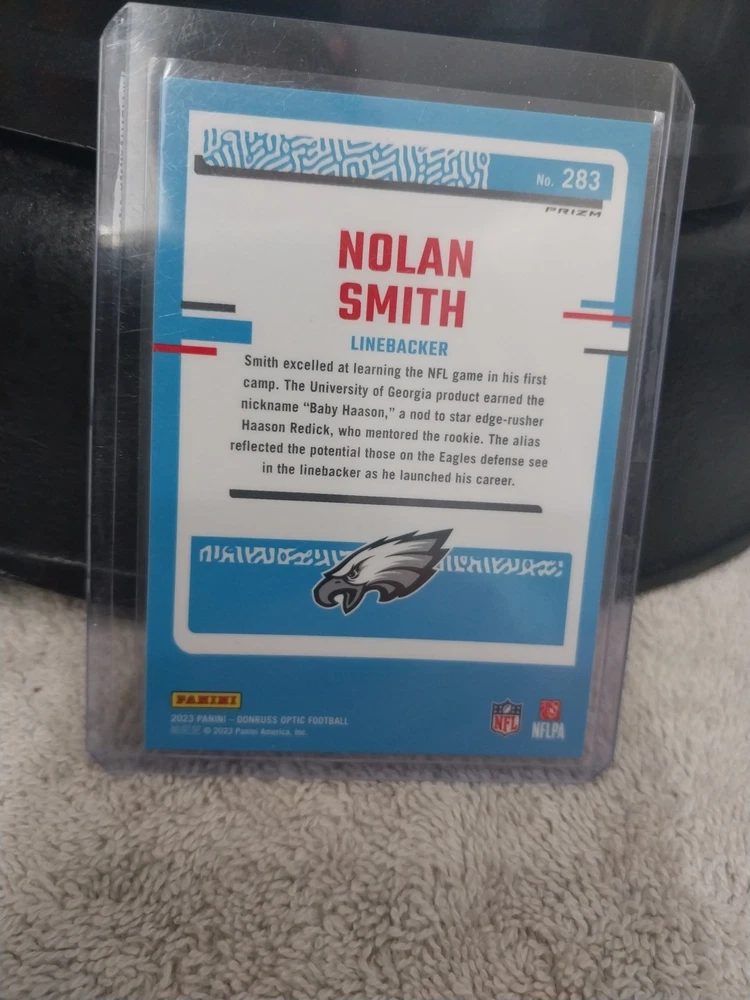 This is a 2023 Panini Donruss Optic sports trading card featuring Nolan Smith of the Philadelphia Eagles. The card is part of the Rated Rookie Blue Hyper Prizm insert set, with a 35 Pt. card thickness. It is an original card made of card stock in English, showcasing Smith as a rookie player in the National Football League (NFL). The card number is 283 and it is licensed by Panini.