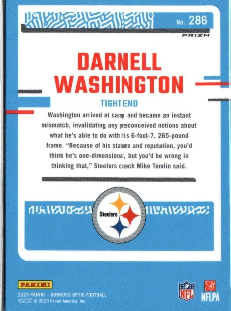 Elevate your collection with the Darnell Washington Blue Hyper Prizm Rated Rookie Card from the 2023 Panini Donruss Optic set. Card number 286 showcases the promising Pittsburgh Steelers tight end in his rookie year, framed by the eye-catching Holo Prizm parallel that makes it a standout piece. This limited edition sports trading card is a must-have for enthusiasts keen on completing their set or simply owning a piece of football memorabilia featuring the potential of Darnell Washington. Crafted in the United States, the card is a testament to the craftsmanship of Panini, known for their quality and attention to detail. With attributes like the exclusive Blue Hyper Prizm design, this card is more than just a collectible—it's a slice of the 2023 NFL season, capturing the excitement of the Super Bowl event. It's a non-autographed, original piece of sports history that resonates with fans and collectors alike.