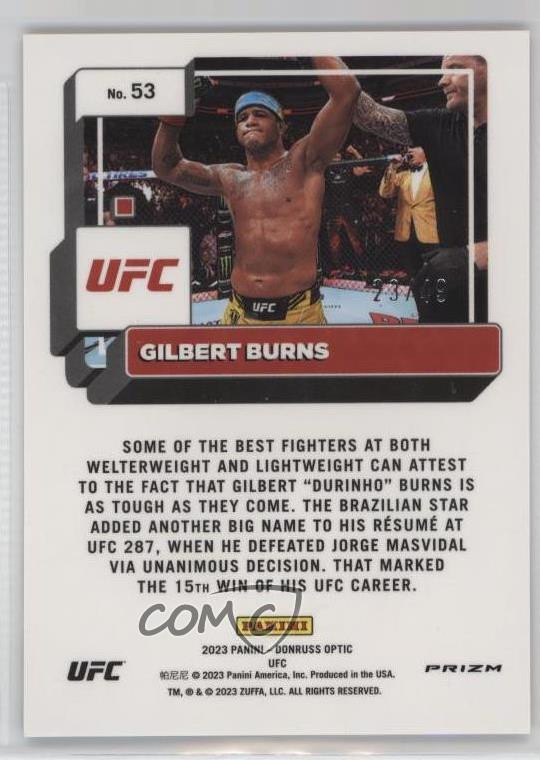 2023 Panini Donruss Optic UFC - [Base] - Orange Prizm #53 Gilbert Burns Qty Made: 49 - MMA Card - Featuring Gilbert Burns Search for more: 2023 Panini Donruss Optic UFC Search for more: 2023 Panini Donruss Optic UFC - [Base] - Orange Prizm View all of our Listings Auctions Buy It Now About Us Located in the beautiful Pacific Northwest, COMC (Check Out My Cards) is the world's largest consignment service for trading card singles. More than 10,000 people have used our consignment service to list over 50 million trading cards. Find out how we can help you consign your items on eBay by contacting us through eBay messaging. COMC -- "The Safe & Easy Way to Buy & Sell" Representative Image - Select Specific Item above to see image of actual item Representative Image - Select Specific Item above to see image of actual item Raw Condition for Modern Cards Unless otherwise noted, raw modern cards are listed in Near Mint-Mint condition or better. A NM-MT card appears to be Mint at first glance, but upon closer inspection, may exhibit some of the following: minor print defects (e.g. roller marks, print line, dimple), minor scratches, slight edge wear, and slight corner wear. Centering is clearly visible in the images provided and does not factor into our condition assessment. Raw Condition for Vintage Cards Unless otherwise noted, raw vintage cards are listed in Excellent condition or better. An EX card may exhibit some of the following: minor rounding of corners, surface wear, print defects, light scratches, and slight edge wear/chipping. Centering is clearly visible in the images provided and does not factor into our condition assessment. Domestic Shipping Combined shipping for multiple items is available. To receive combined shipping, please ensure all desired items are in your eBay shopping cart before proceeding to checkout. eBay limits orders to 40 items per order. We automatically combine multiple orders placed on the same day. If you place multiple orders on the same day, please contact us to request a refund of applicable shipping costs. Signature confirmation may be required on invoices over $400. All cards are protected and shipped securely. International Shipping COMC offers eBay's International Shipping (EIS) for international orders under $2,500* (see country exceptions below). All duties and import fees are paid at checkout; in the rare event that there are additional import fees upon delivery, these are borne by the buyer. EIS packages route through a shipping hub in Erlanger, KY before shipping to their final destination. Please note that EIS does not allow for combined shipments. The shipping rates are determined by eBay and cannot be adjusted. *Maximum sale price exceptions: Colombia, Kuwait ($2,000); Taiwan ($1,539); Chile, Costa Rica, Guatemala, Honduras, Trinidad and Tobago ($1,000); Antigua and Barbuda, Aruba, Belize, Dominica, Grenada, Philippines, Saint Kitts and Nevis, Saint Lucia, Montserrat, Turks and Caicos Islands ($500); Dominican Republic, El Salvador ($200). Please request a shipping quote through eBay messaging for orders that exceed the maximum sale price supported by eBay's International Shipping. You will be responsible for all duties and import fees for international orders shipped outside the EIS. All cards are protected and shipped securely. Payment COMC does not accept offers on our cards through our eBay storefront. COMC utilizes eBay’s managed payments system. If you are experiencing difficulties making a payment, please contact eBay for assistance. Return Policy Returns are only accepted on the rare occasion the item is not as described. If you are making a return, please initiate the return process through eBay so a mailing label can be provided for you. Prior to listing, our expert team carefully assessed this item to represent it accurately. Please review the description and high-definition images prior to purchasing to ensure this item meets your satisfaction. We welcome you to contact us if you have further questions about this item. Trust and Integrity COMC carefully assesses each item consigned to us to prevent fraudulent items from entering the marketplace. If you believe an item offered on COMC may be fraudulent, please contact us with details so we can investigate the issue. Items we determine are outside our supported items policy may be removed. Last Modified: 3/4/2025 3:15:33 PM PDT