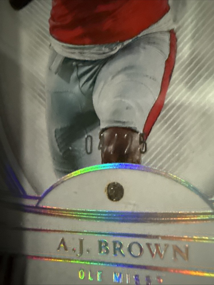 The product is a 2023 Panini Flawless Collegiate trading card featuring A.J. Brown from the Ole Miss Rebels, Tennessee Titans, and Philadelphia Eagles. It is a Diamond Gem parallel variety, serial numbered to /25. The card is in near mint or better condition and includes limited edition and collectors edition features. It is an insert card with memorabilia and has the card number D-25 for the 2023 season.