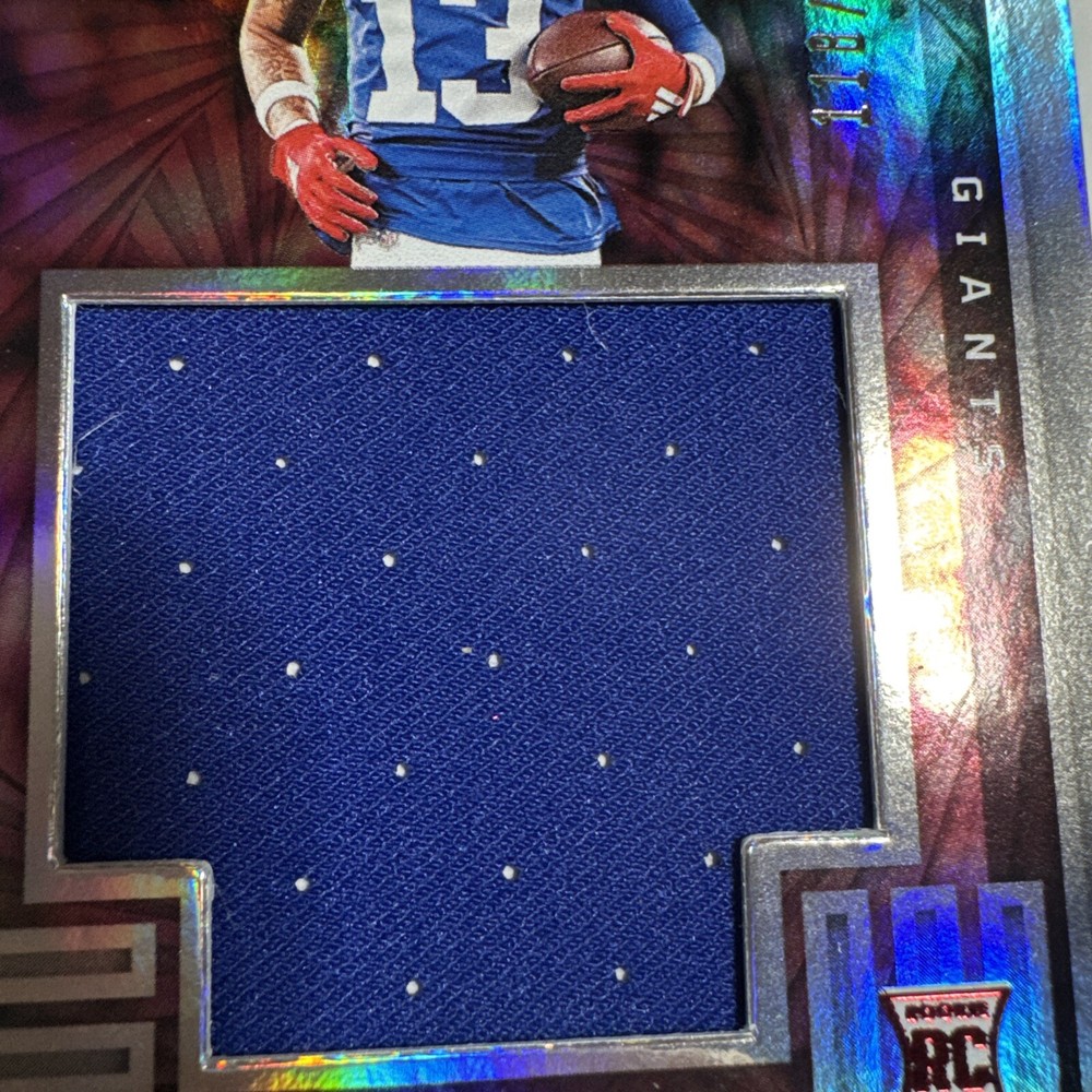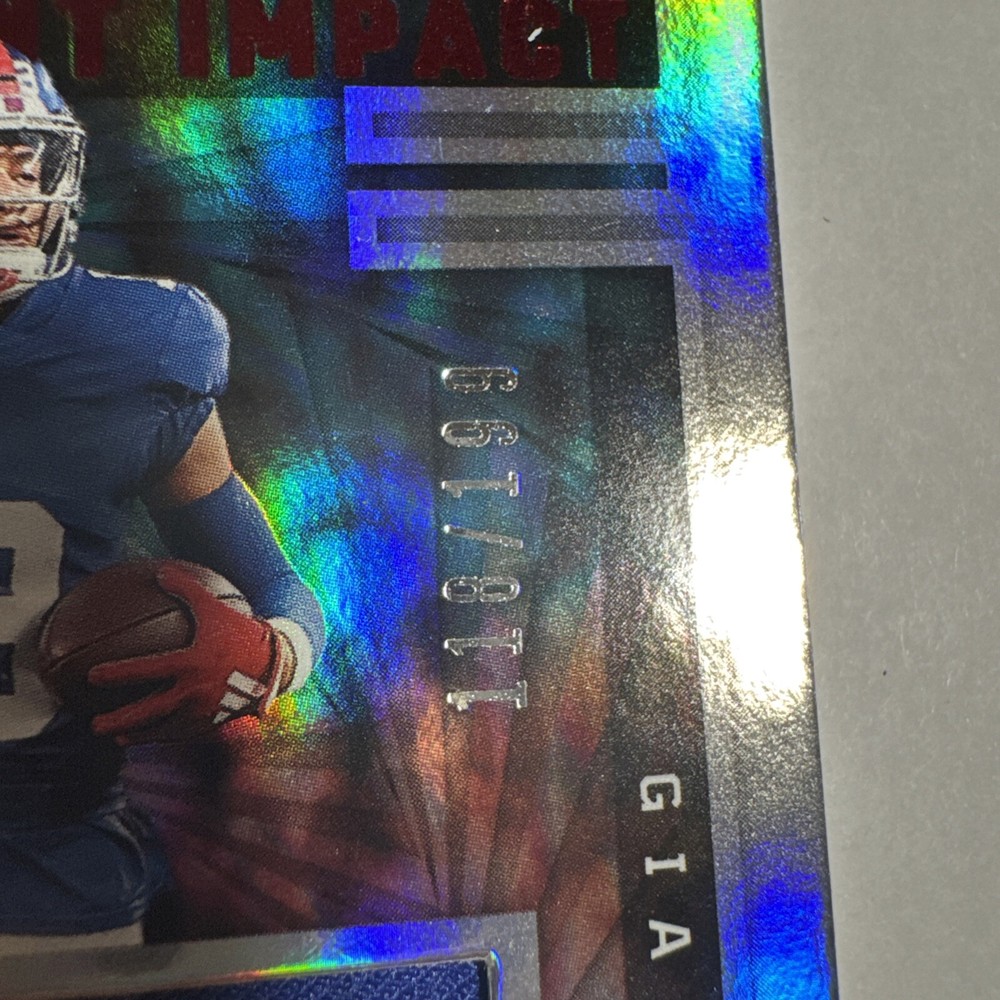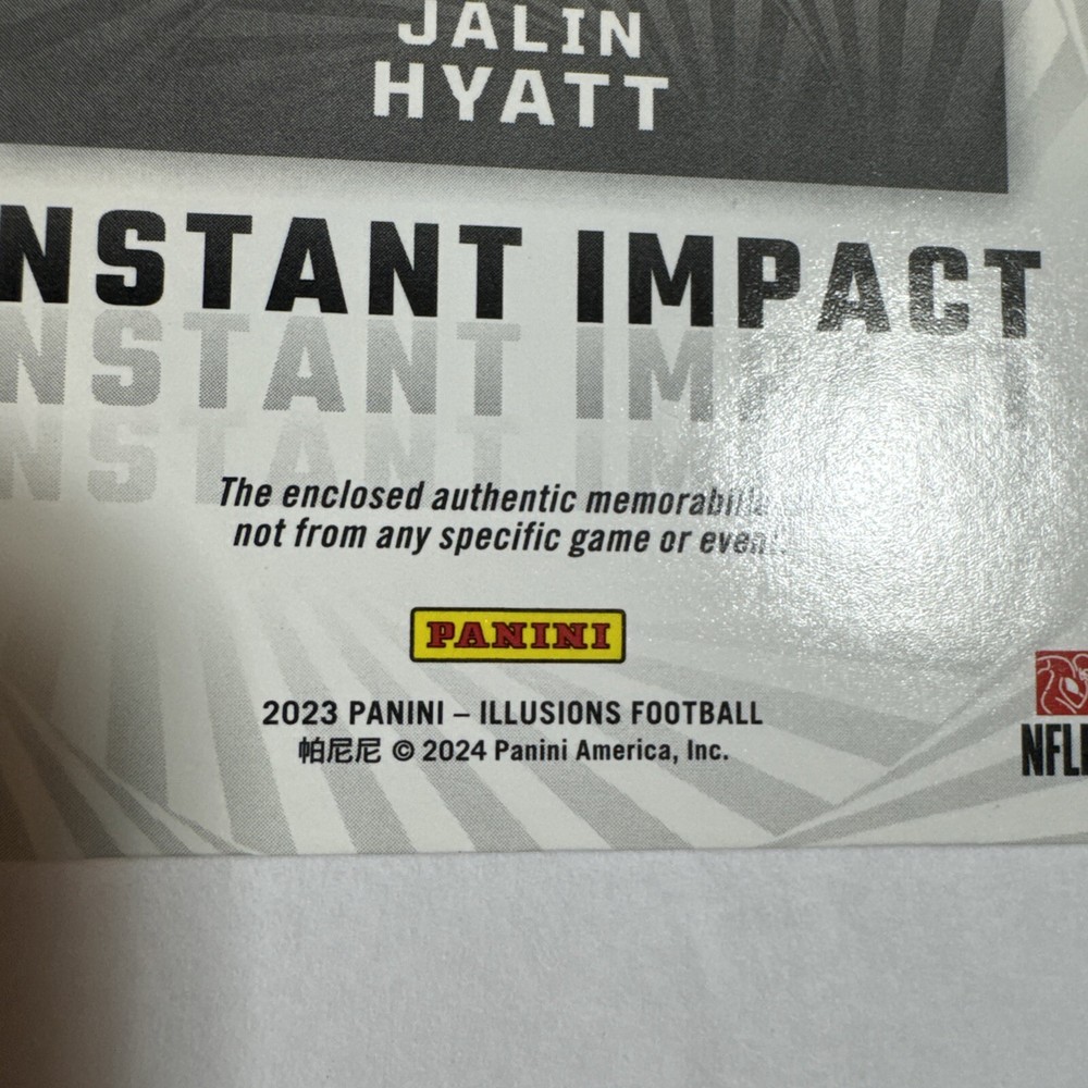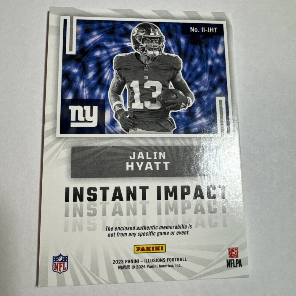 The 2023 Panini Illusions trading card features rookie football player Jalin Hyatt from the New York Giants. This particular card is from the Instant Impact Red parallel set and is limited to only 199 copies. The card is in near mint or better condition and showcases Hyatt in his Giants jersey. It is a standard-sized card manufactured by Panini for the National Football League (NFL) season of 2023, making it a desirable collectible for fans and trading card enthusiasts.