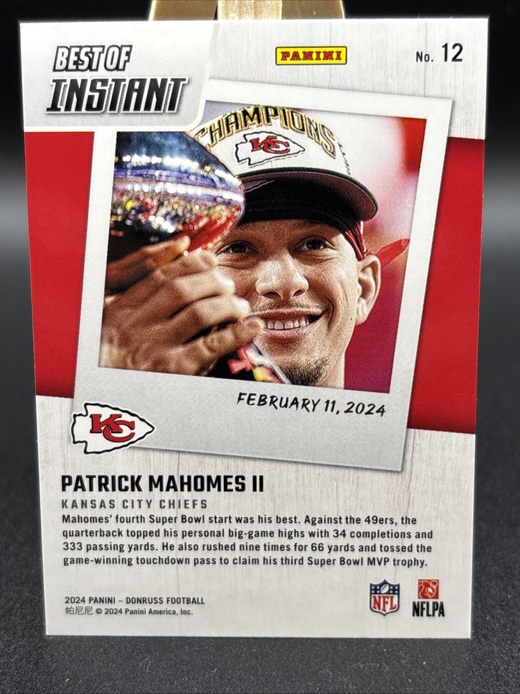 This is a 2023 Panini sports trading card featuring Patrick Mahomes of the Kansas City Chiefs, commemorating his 3rd Super Bowl MVP win. The card is a Short Print with card number 213, part of the 2023 Panini set.