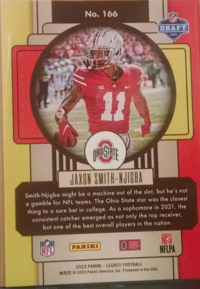 This 2023 Panini Legacy sports trading card features Jaxon Smith-Njigba of the Ohio State Buckeyes. As a rookie, this card is highly sought after by fans and collectors alike. The card number is 166 and it is part of the 2023 set. This card is RAW but will ship in a penny sleeve and top loader to maintain its existing condition. This card is perfect for any fan of the National Collegiate Athletic Association (NCAA) and football in general. Manufactured by Panini, this card is of the highest quality and is sure to be a valuable addition to any collection. Don't miss your chance to own this card!