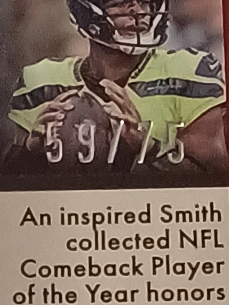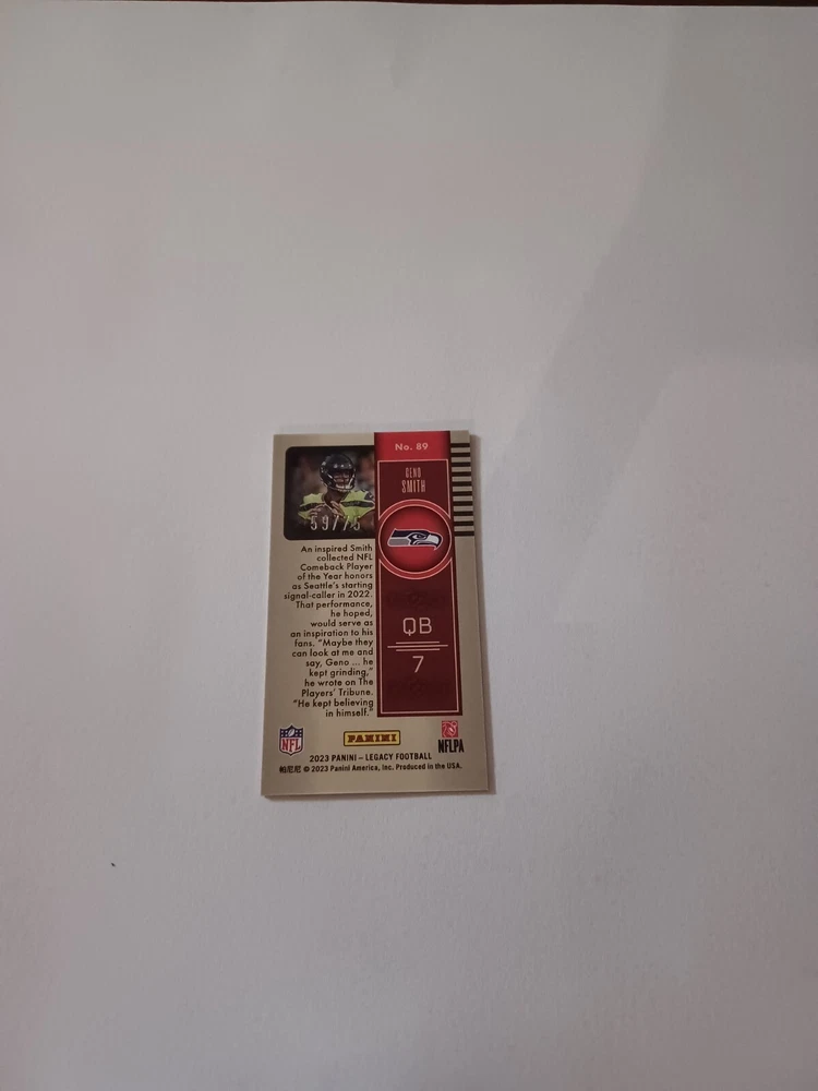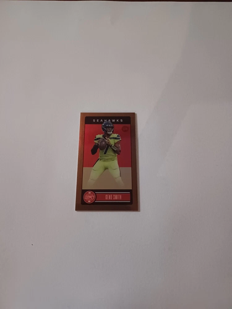This 2023 Panini Legacy - Premium Edition Mini Bronze #89 Geno Smith /75 trading card is a must-have for Seattle Seahawks fans and collectors. Featuring the National Football League (NFL) player in his team uniform, this card is a part of the Panini Legacy series and is serial numbered for authenticity. The card is in excellent shape and is perfect for those who are looking for a premium edition mini bronze card. With a print run of only 75, this card is a rare find and is sure to be a valuable addition to any collection. Don't miss out on the opportunity to own this unique sports trading card.