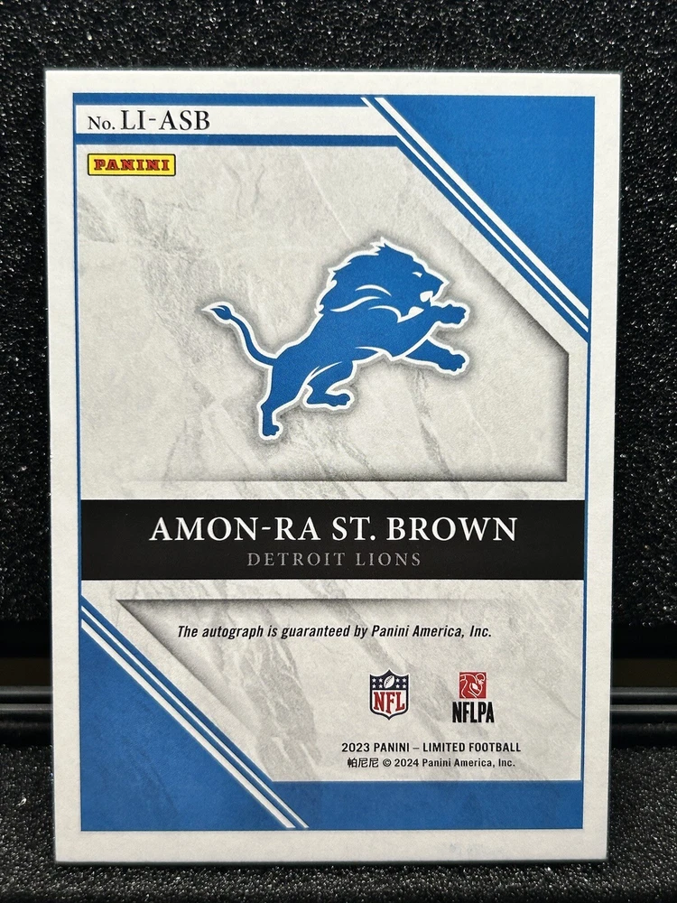 This is a rare and highly sought-after 2023 Panini Limited Amon-Ra St Brown Limited Ink Auto #/25 trading card. It features the talented Detroit Lions player in a limited ink design and is serial numbered for added authenticity. The card is perfect for avid collectors of sports trading cards, especially those who are fans of the NFL and football in general. In addition to the autograph, this card also boasts a short print and parallel/variety feature, making it an even more unique addition to any collection. With its beautiful design and high-quality manufacturing, this card is sure to impress any fan of Amon-Ra St. Brown and the Detroit Lions.