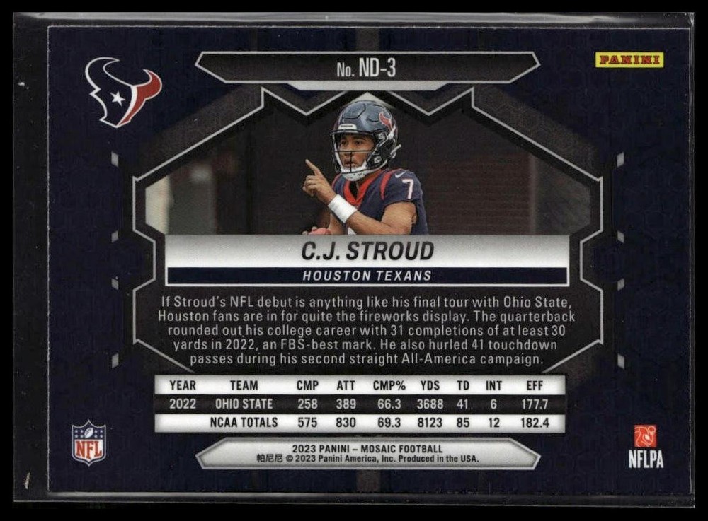 This is a nice example of a 2023 Panini Mosaic #ND-3 C.J. Stroud .Other important information about this card: In 2023 C.J. Stroud played for the Houston Texans.Please check out our other listings for more great cards. Shipping can be combined! First card is $1.25 - each additional card is $0.50. Up to 2 cards will be toploaded, additional cards won/paid for will be in a penny sleeve. Thank you for your business!