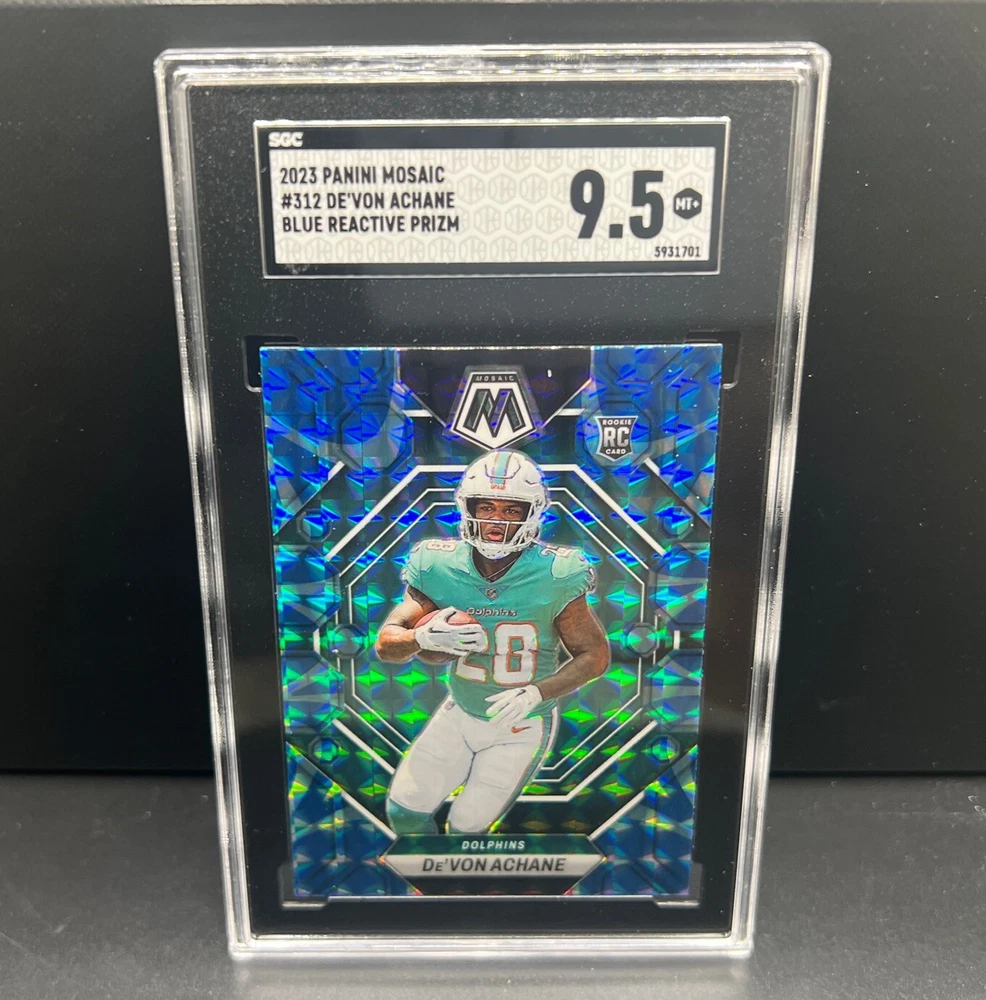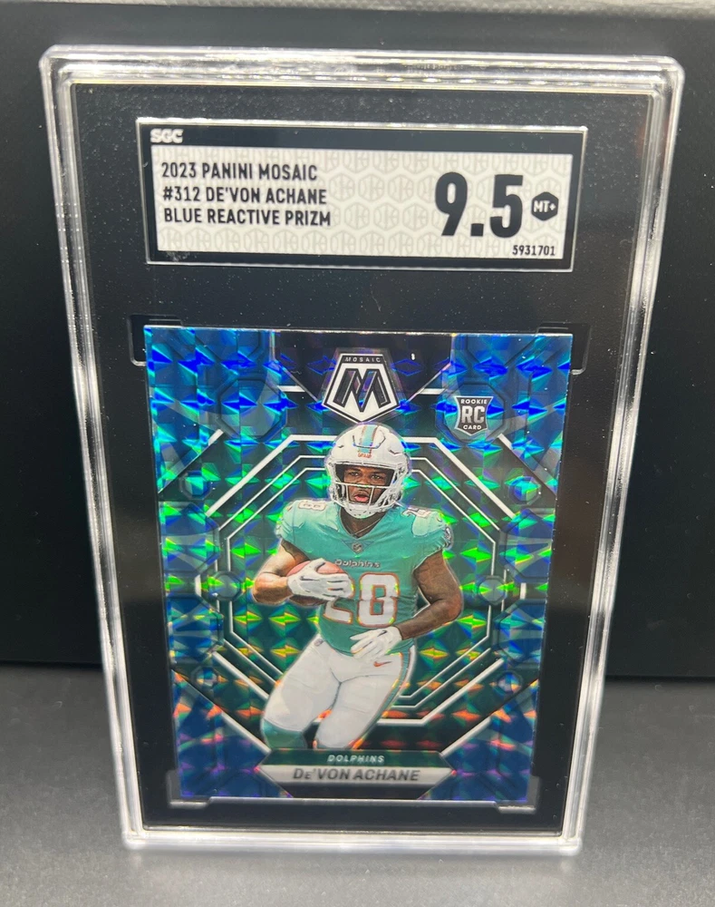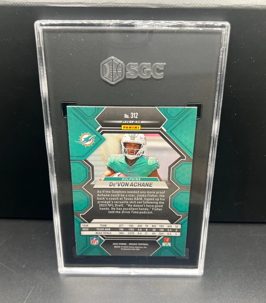 Elevate your sports memorabilia collection with the 2023 Panini Mosaic DE'VON ACHANE Reactive Blue Prizm Rookie card. As a standout addition, this card showcases the exciting Miami Dolphins rookie in vibrant Reactive Blue Mosaic Prizm, a parallel variety that catches the eye with its stunning design and rarity. Expertly manufactured by Panini, the card is part of the renowned 2023 Panini Mosaic set and carries the card number 312. It has been meticulously graded by the Professional Sports Authenticator (PSA) and awarded a perfect score of 10, confirming its premium quality and authenticity. Whether you're a devoted NFL fan or a serious collector, this card is a prime choice for its aesthetic appeal and investment potential.
