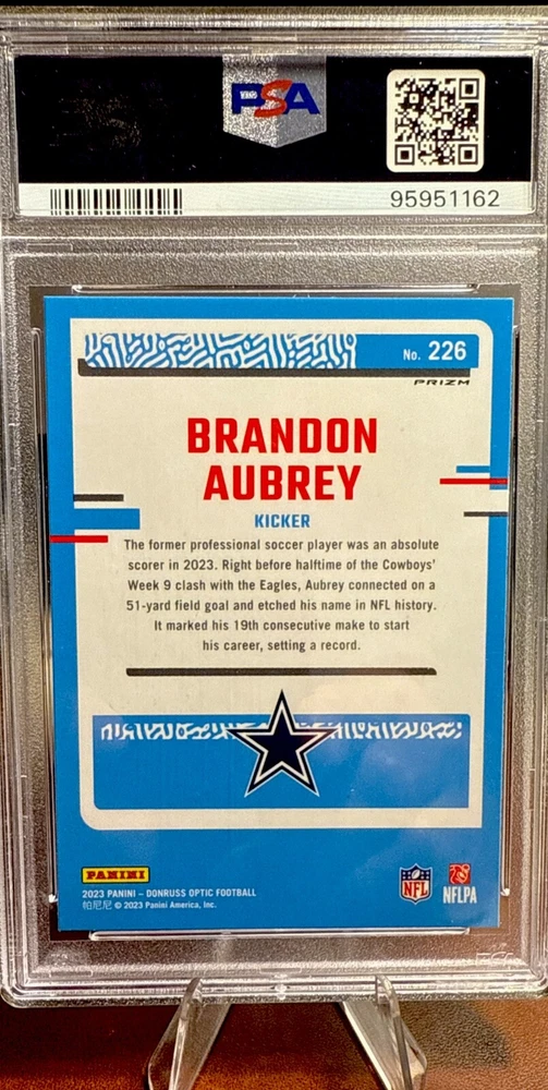 Sport: Football Autograph Authentication: Donruss League: National Football League (NFL) Features: Parallel/Variety, Base Set, Rookie Team: Dallas Cowboys Manufacturer: Panini Player/Athlete: Brandon Aubrey Card Number: 226 Set: 2023 Panini Donruss Optic Season: 2023 Type: Sports Trading Card Parallel/Variety: Purple Shock Prizm
