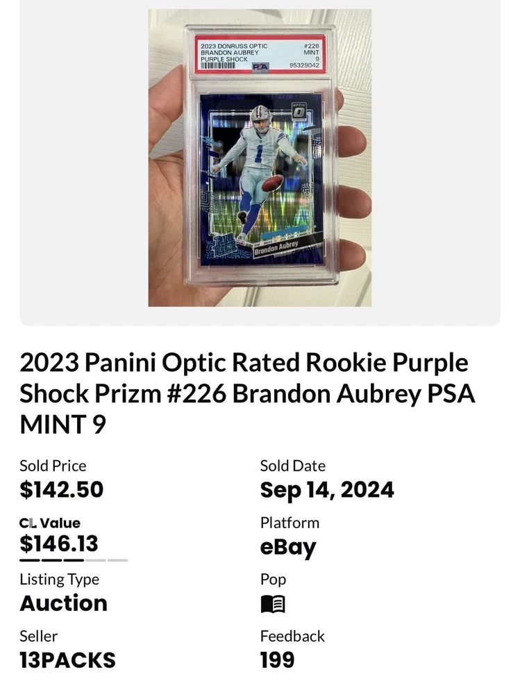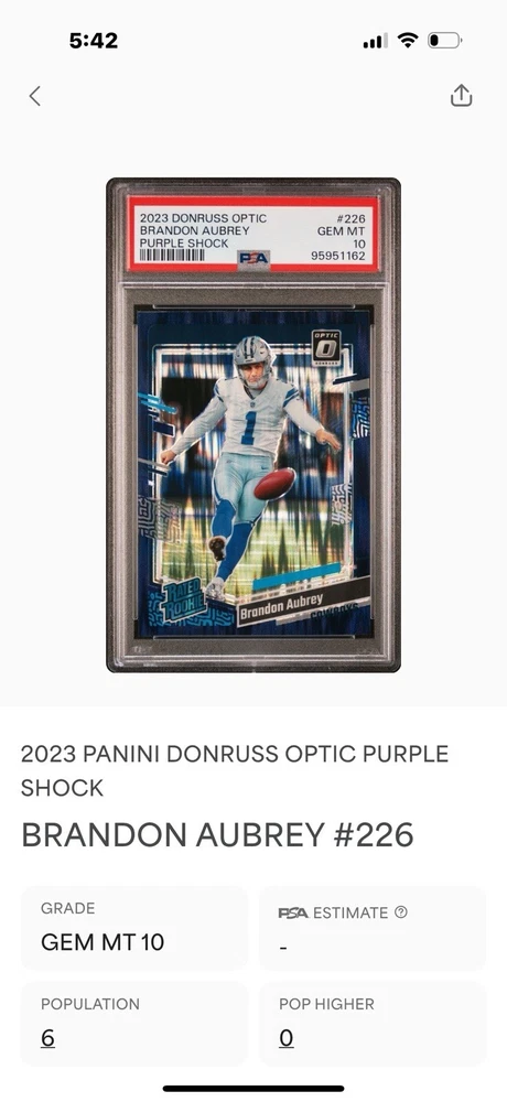 2023 Panini Optic Brandon Aubrey Rated Rookie Purple Shock #226 PSA 10💥Pop 6