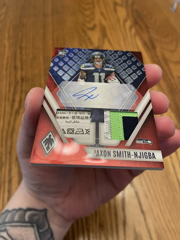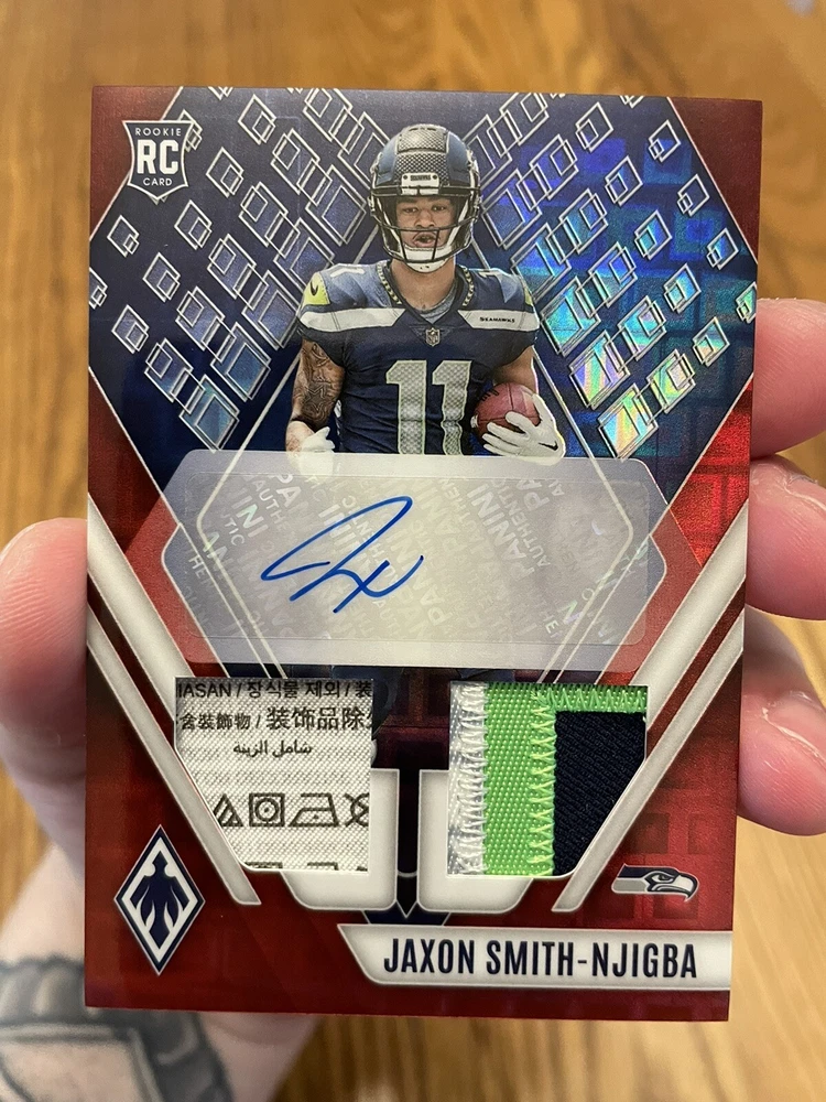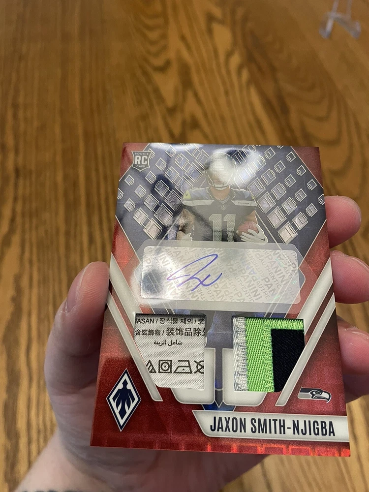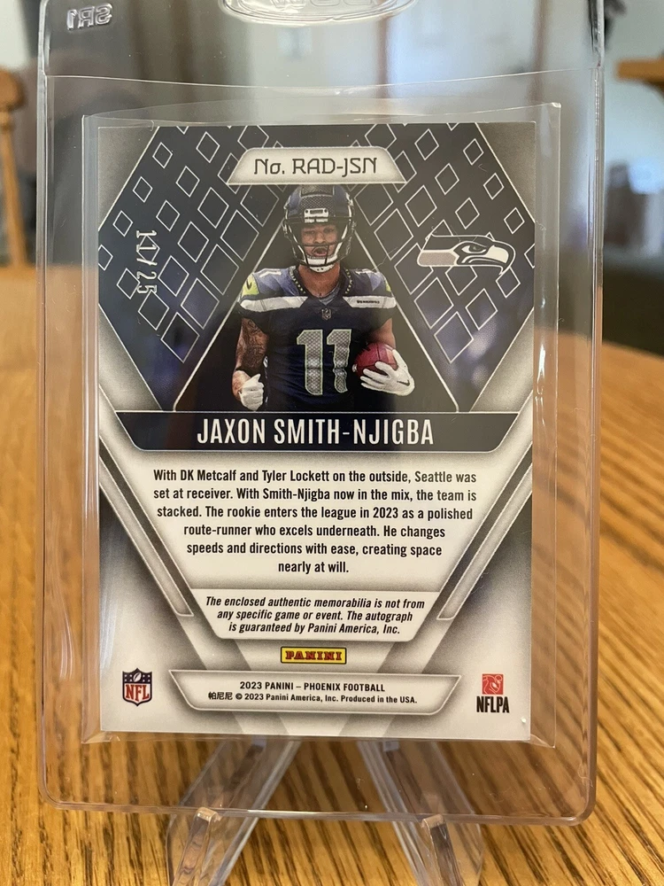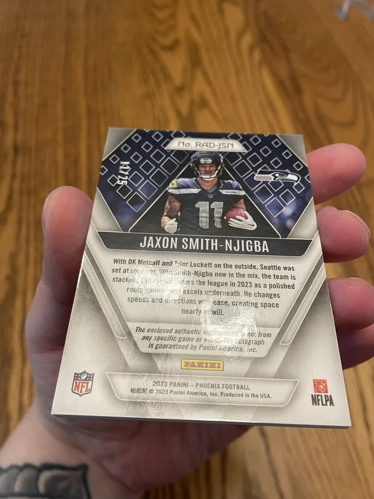 Features: Rookie Autographed: Yes Team: Seattle Seahawks Card Number: RAD-JSN Type: Sports Trading Card Player/Athlete: Jaxon Smith-Njigba Parallel/Variety: Premium Patch Season: 2023 Sport: Football League: National Football League (NFL) Set: 2023 Panini Phoenix Manufacturer: Panini