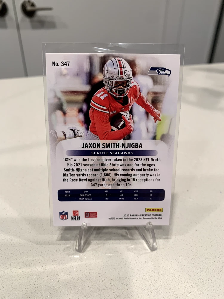 For avid collectors of sports trading cards, here's your chance to own a 2023 Panini Prestige Jaxon Smith-Njigba Rookie Card. This rare card features the talented football player and athlete in his rookie season, making it a must-have item for fans and collectors alike. The card is manufactured by Panini and is part of the 2023 set. Its features include a striking design and high-quality printing, making it a valuable addition to any collection. Don't miss your chance to own this unique sports trading card.