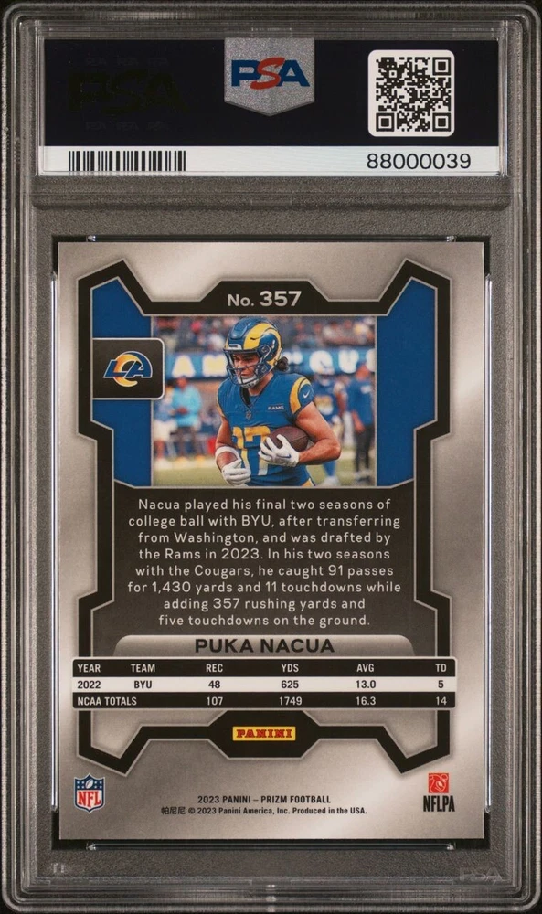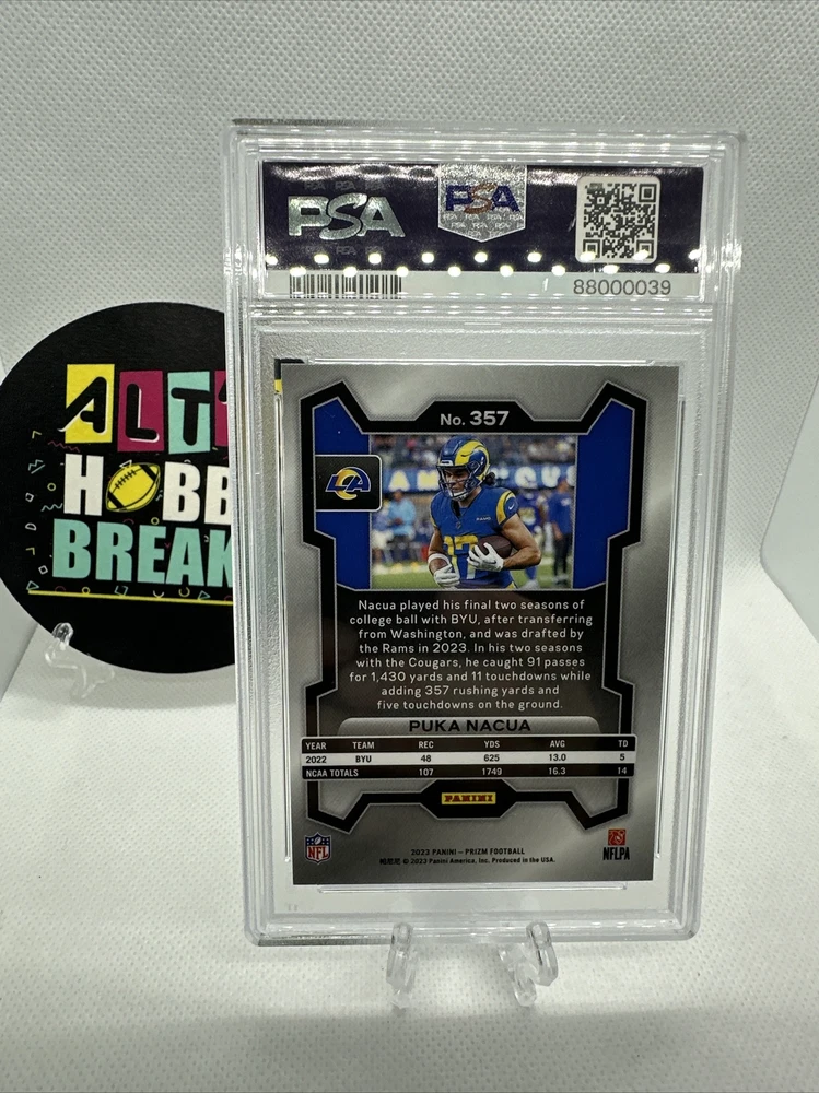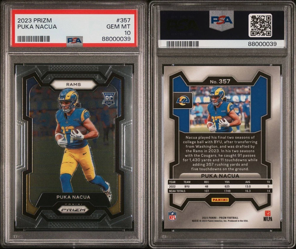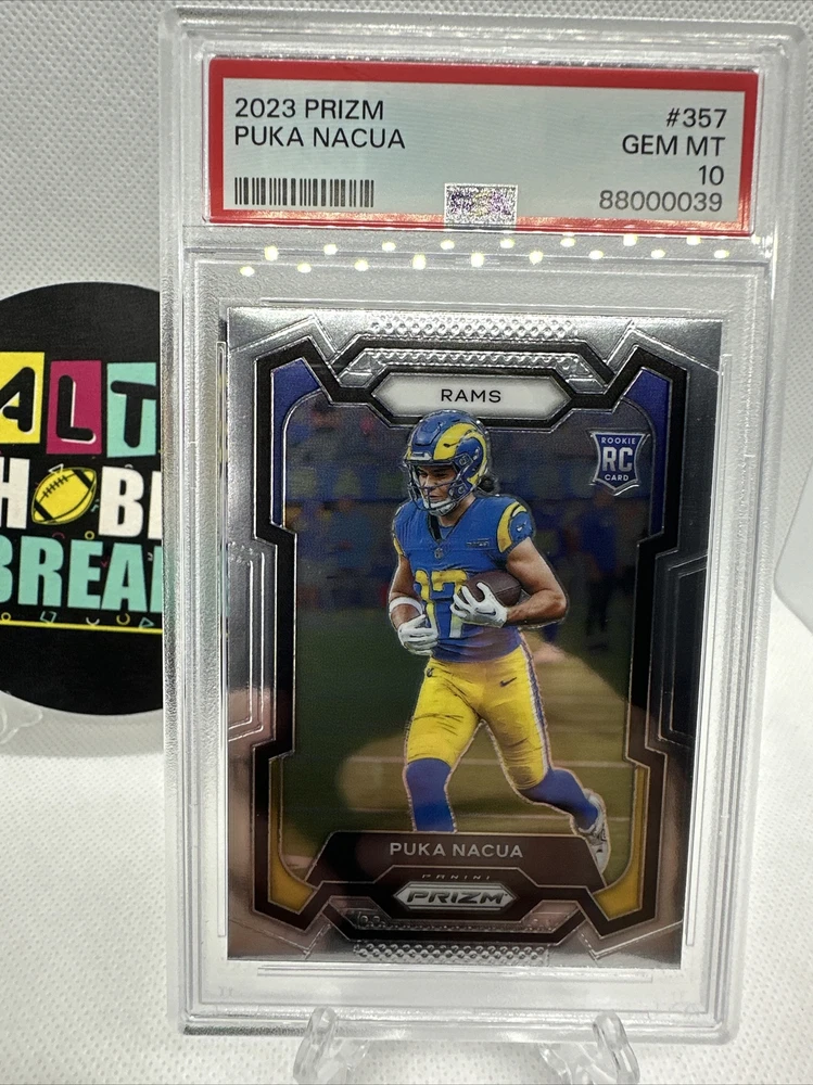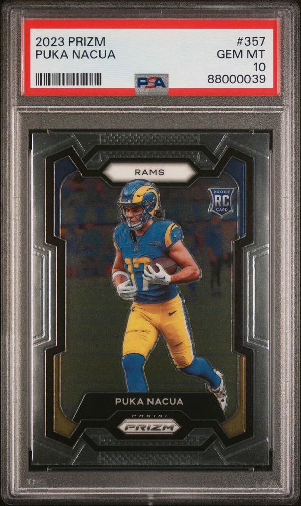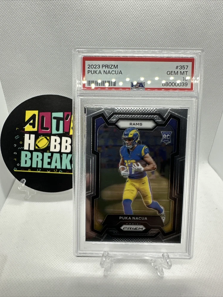 This 2023 Panini Prizm trading card features Puka Nacua, a rookie for the Los Angeles Rams in the National Football League (NFL). The card is a base PSA 10 Gem Mint grade and comes from the 2023 Panini Prizm set. It is a Prizm parallel/variety with no autograph and features a picture of Nacua in his jersey. This sports trading card is perfect for any football fan or trading card collector. The card is manufactured by Panini and has been professionally graded by Professional Sports Authenticator (PSA). It is a must-have for any fan of Puka Nacua or the Los Angeles Rams.