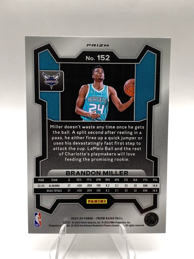 Set: 2023 Panini Prizm Manufacturer: Panini Card Size: Standard Card Number: 152 Card Name: Panini Prizm Silver Brandon Miller Team: Alabama Crimson Tide, Charlotte Hornets Player/Athlete: Brandon Miller Type: Sports Trading Card Sport: Basketball, Football Language: English Vintage: Yes Year Manufactured: 2023 Country/Region of Manufacture: United States Event/Tournament: NBA Finals Features: Parallel/Variety, Rookie Parallel/Variety: Silver Prizm League: National Basketball Association (NBA) Season: 2023 Autographed: No