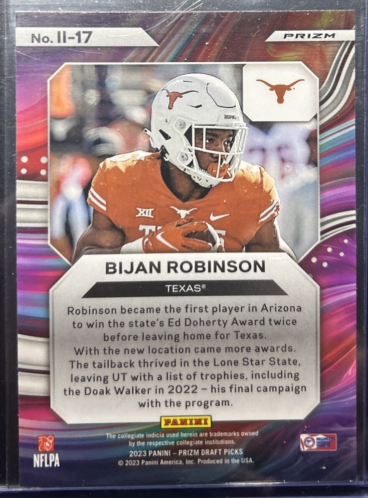 The product is a 2023 Panini Prizm Draft Picks trading card featuring Bijan Robinson, identified by the card number II-17. This specific card is from the "Instant Impact Gold Ice" subset, indicating it may have a special design or rarity. The card is described to be in near mint or better condition, making it highly desirable for collectors. With its focus on a prominent college football player like Bijan Robinson, this trading card is likely to be sought after by fans and collectors alike for its potential future value.