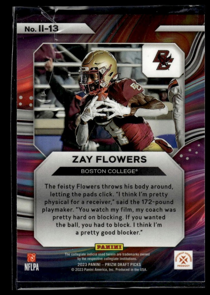 This is a nice example of a 2023 Panini Prizm Draft Picks #II-13 Zay Flowers Instant Impact Other important information about this card: Chase,Checklist,Parallel,Insert,SP,RC In 2023 Zay Flowers played for the Boston College Eagles. Please check out our other listings for more great cards.