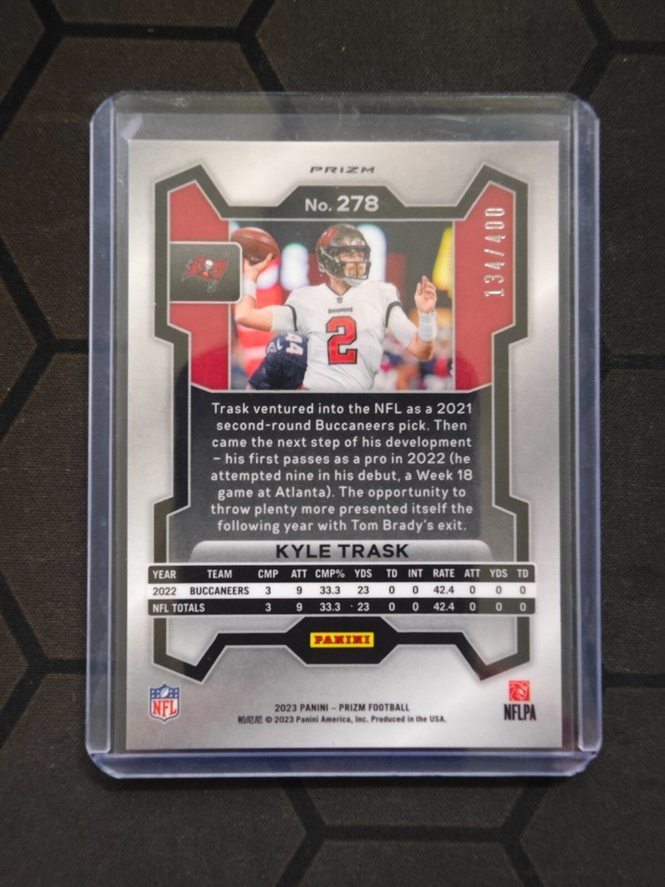 Type: Sports Trading Card Country/Region of Manufacture: United States Card Size: Standard League: National Football League (NFL) Season: 2023 Set: 2023 Panini Prizm Language: English Autographed: No Team: Tampa Bay Buccaneers Sport: Football Parallel/Variety: Pandora Prizm Manufacturer: Panini Player/Athlete: Kyle Trask Year Manufactured: 2023