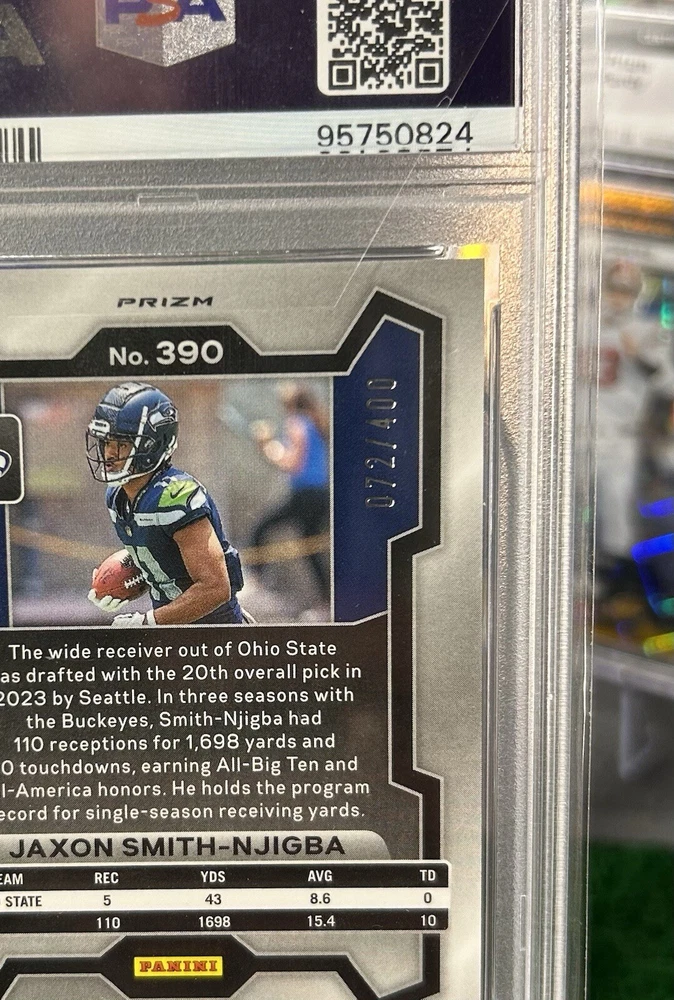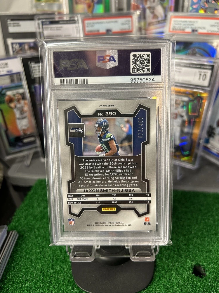 This 2023 Panini Prizm trading card features Jaxon Smith-Njigba of the Seattle Seahawks. The card is part of the base set and is a rookie card. It is also a parallel variety, with a print run of 400. The card is graded a 10 by the Professional Sports Authenticator (PSA) and comes with a serial number. The card is a National Football League (NFL) licensed product and is perfect for collectors of sports trading cards. The card number is 390 and it is from the 2023 season. Get this rare and valuable card now for your collection!