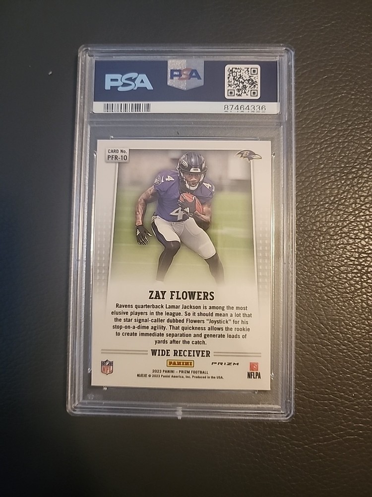 This is a Zay Flowers 2023 Panini Prizm Silver Flashback Rookie trading card graded as GEM MINT PSA 10. It features hologram technology in a color Silver, Prizm parallel variety, manufactured by Panini.