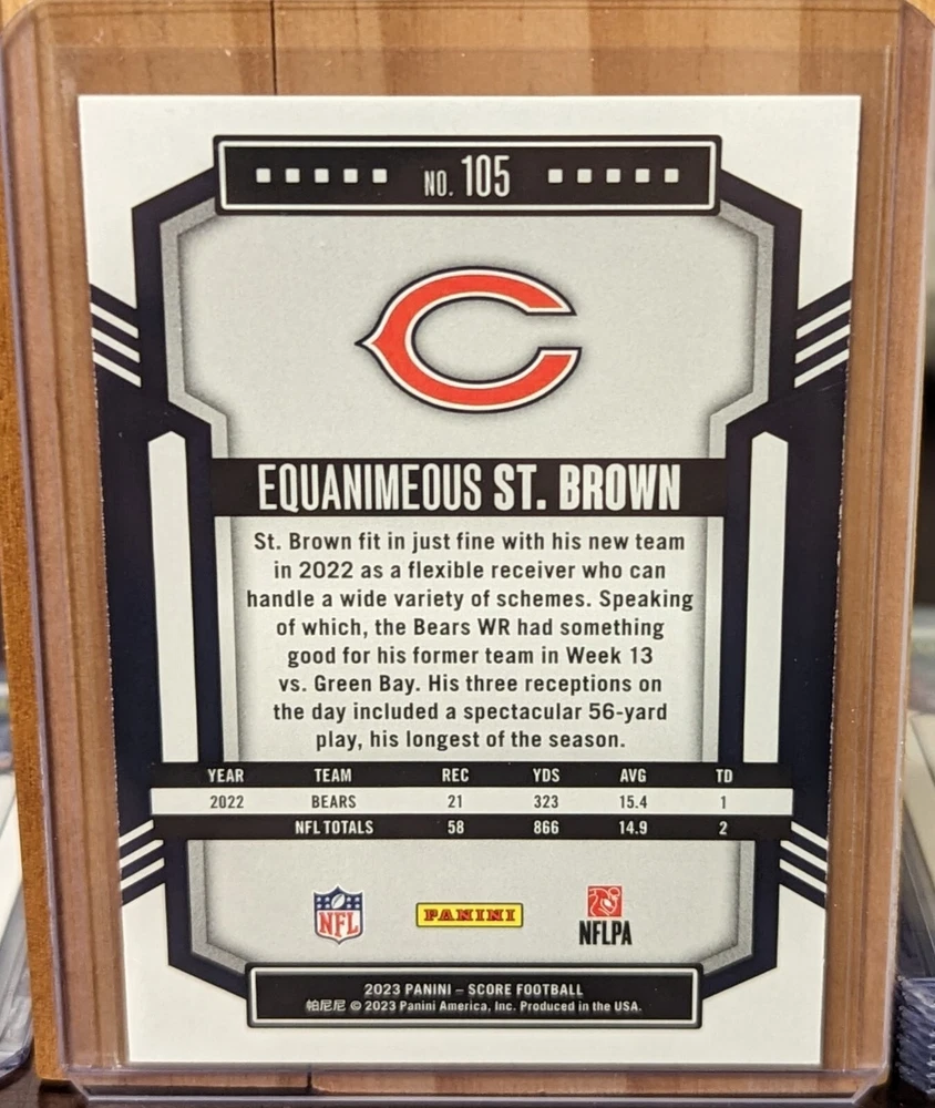 Card Number: 105 Team: Chicago Bears Type: Sports Trading Card Year Manufactured: 2023 Sport: Football Season: 2023 Vintage: No Manufacturer: Panini Score Set: Panini Score Player/Athlete: Equanimeous St. Brown League: NFL Autograph Authentication: Score Autographed: No Features: Base Set