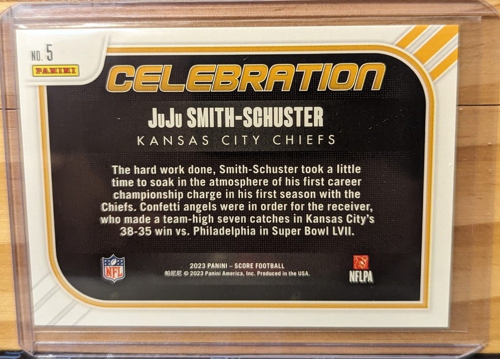 This 2023 Panini Score Celebration Juju Smith-Schuster #5 trading card is a must-have for any sports fan. Show your support for the Kansas City Chiefs with this National Football League (NFL) card featuring the star player. This original card is part of the 2023 Panini set and is perfect for collectors or enthusiasts of football trading cards. Featuring the iconic Juju Smith-Schuster, this sports trading card is an insert in the 2023 Panini set. This card is ungraded, but in near mint condition, and will ship in a penny sleeve and top loader to maintain its existing condition. Whether you're a collector or a sports fan looking for memorabilia, this card is sure to impress.