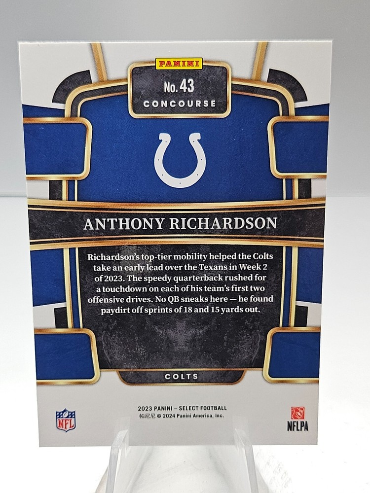 Manufacturer:PaniniSeason:2023Country of Origin:United StatesAutographed:NoVintage:NoSet:2023 Panini SelectFeatures:Base Set, Rookiegtin13:Does not applyOriginal/Licensed Reprint:OriginalSport:FootballCard Name:Concourse LevelLanguage:EnglishLeague:National Football League (NFL)Material:Card StockPlayer/Athlete:Anthony RichardsonUPC:Does not applyYear Manufactured:2023Card Number:43Type:Sports Trading CardParallel/Variety:BaseCard Size:StandardTeam:Indianapolis ColtsCard Thickness:35 Pt.